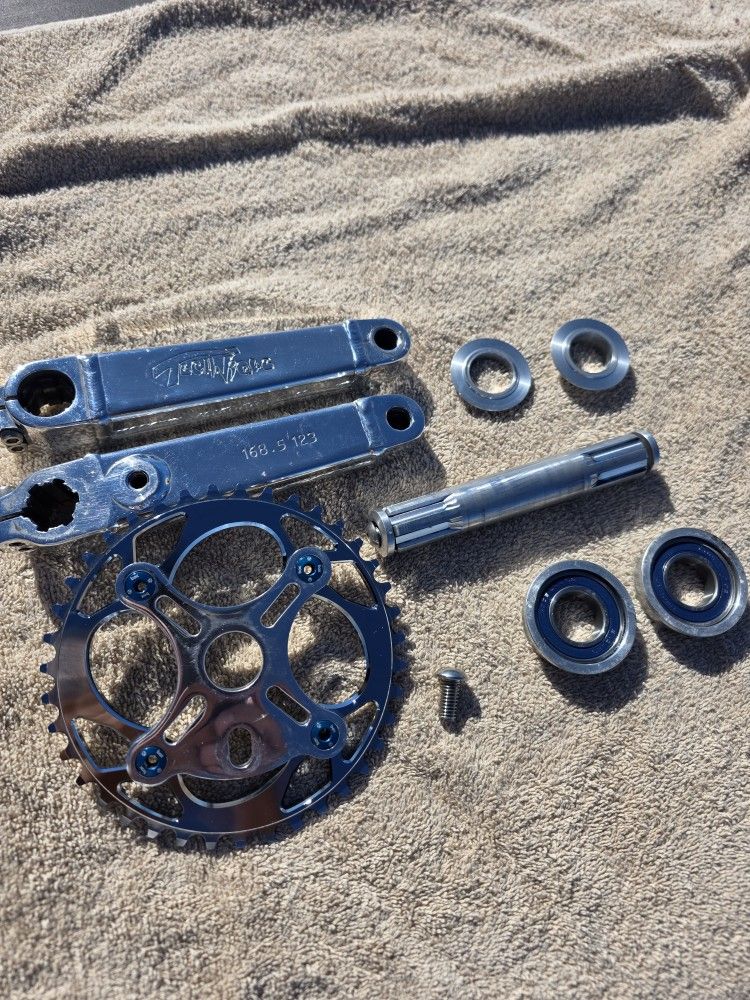 Currently located in Apple Valley but will be dropping off the parts im liisting this week with my son near the 101fwy exit and Benton way. But if you are willing to come up to Apple Valley before, im open to offers. I put some polish on them but if you have a polishing machine, these will look chrome after your done. Easy peasy Technique 19mm spindle 168.5mm crank lenght. Bearing inner cups have some knocks from taking them off. The bearings spin fine. Technique 39t chainring and 4 bolt Spider.