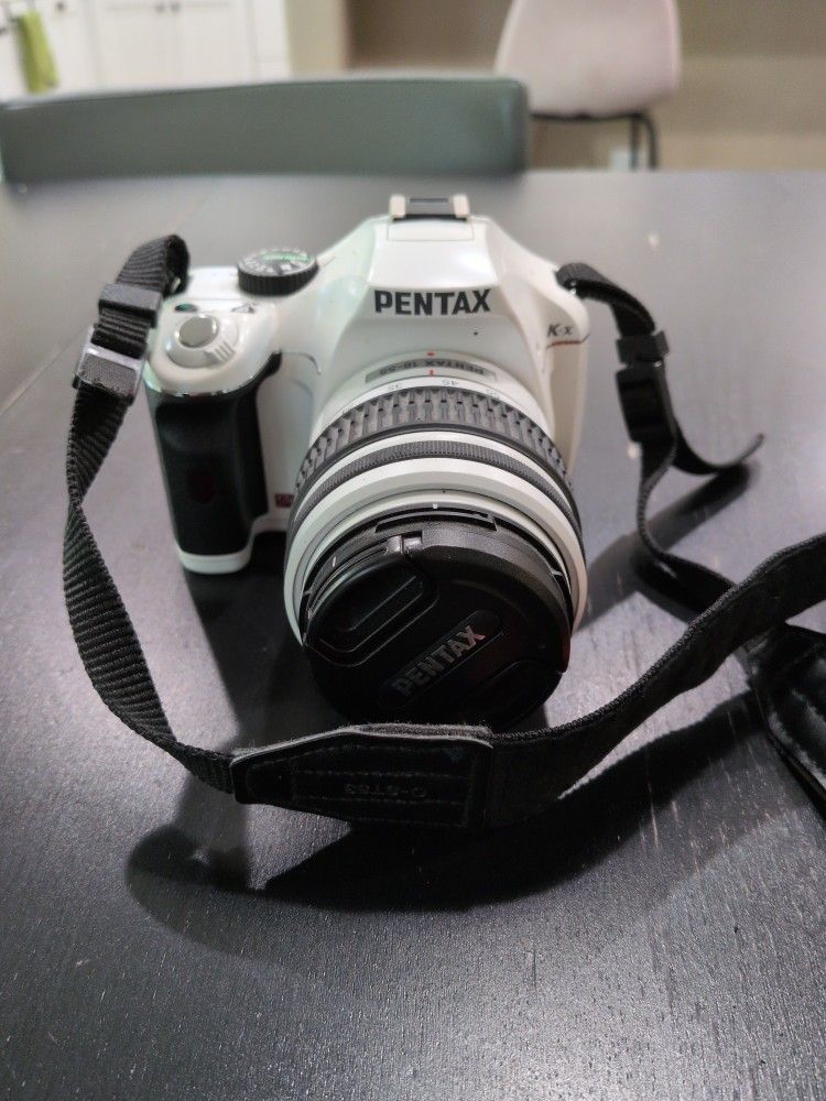 Pentax K-x Body + lens. Great DSLR for beginners. Lens is a Pentax DA-L 18-55mm.