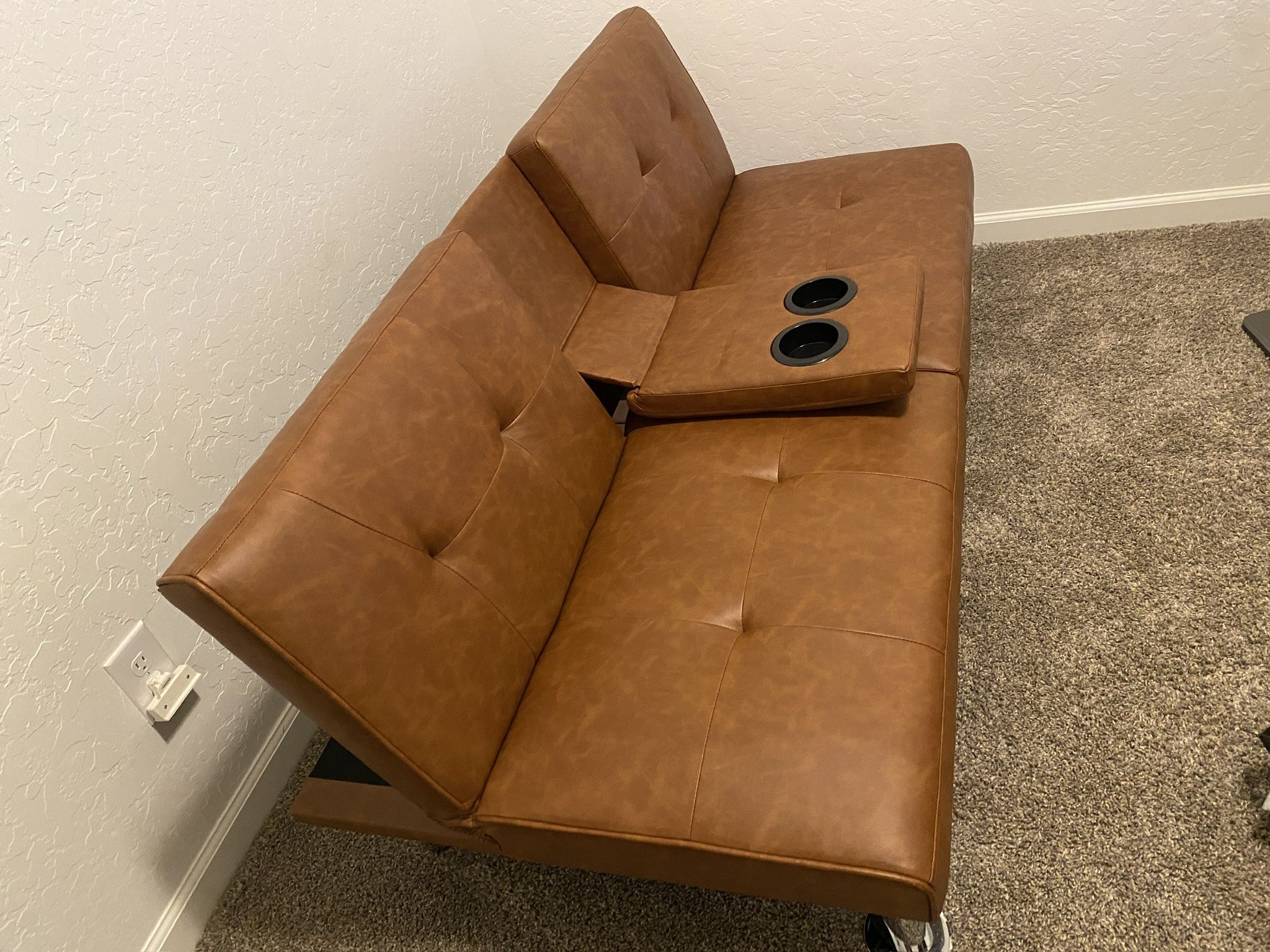 Folds in 3 positions: lays flat, reclines, and sits fully upright. Very clean and lightly used. Center portion can fold down to be used as cupholders. Cna be partially disassembled for easy transportation.
