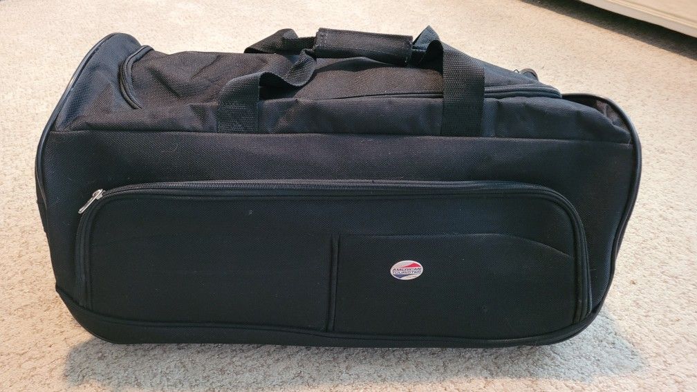 American Tourister Duffle bag Black Rolling duffle bag Handles-top & side Side pocket Brand new, clean Came in a set of three, but I didn't need a duffle bag Sturdy 22"L x 11" H x 11"W Will remove posting when the item is sold