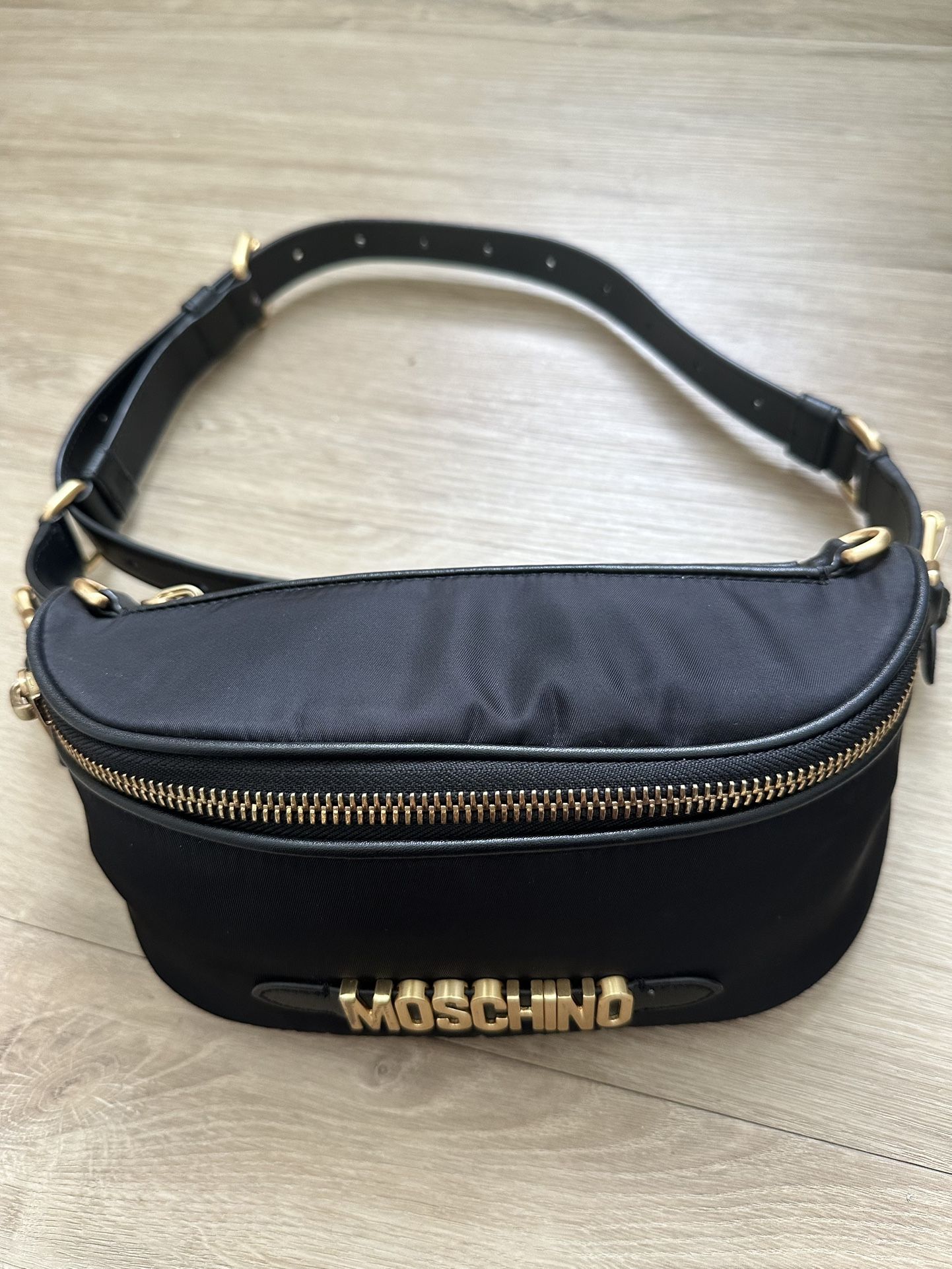Front zip closure Leather trim Goldtone hardware One outside back top zip pocket One inside credit card slot Lined Nylon Imported SIZE Adjustable leather belt strap, 4.5"-17" drop 10"W x 4.5"H x 3.5"D