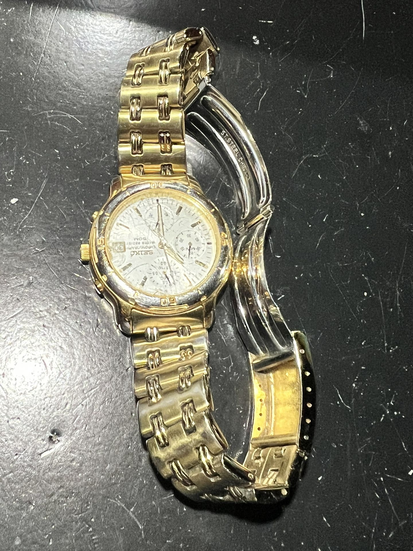 Vintage Seiko Quartz Chronograph 50M Gold Tone Watch & Metal Band V(contact info removed) JUST NEED A BATERRY