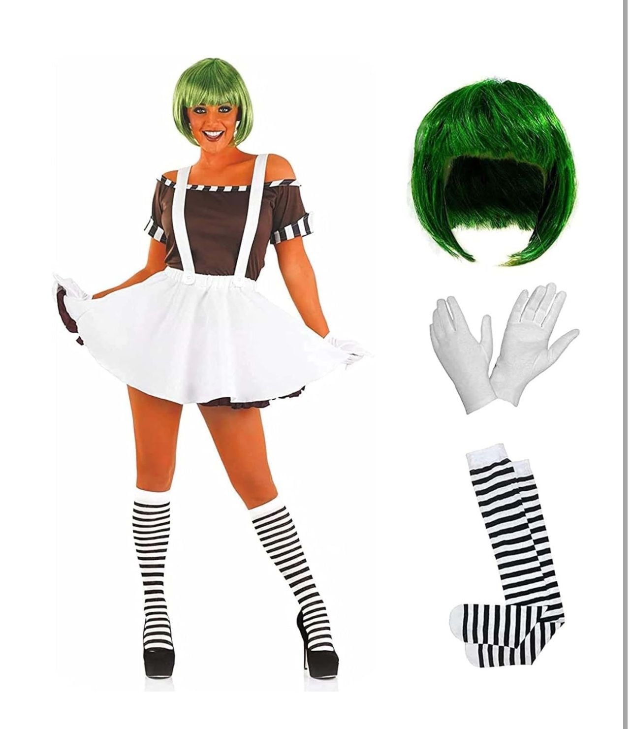 Includes green bob wig, brown striped top, white gloves, white skirt with braces, and lees high striped socks.