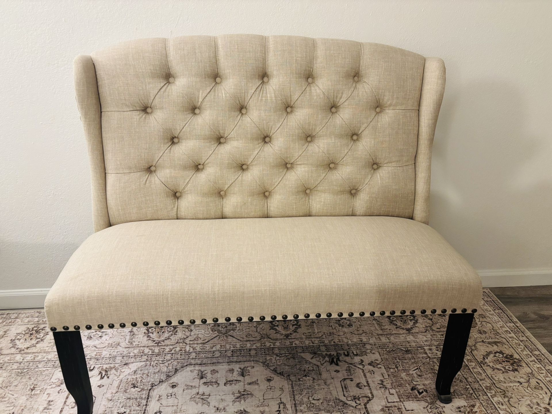 Almost New!!!!! Beige color! We don’t use this bench as much as I thought we would Perfect for dinning tables or whatever you needed it for. It’s very comfortable and stable. 40H 17D Off I225 and Iliff Aurora