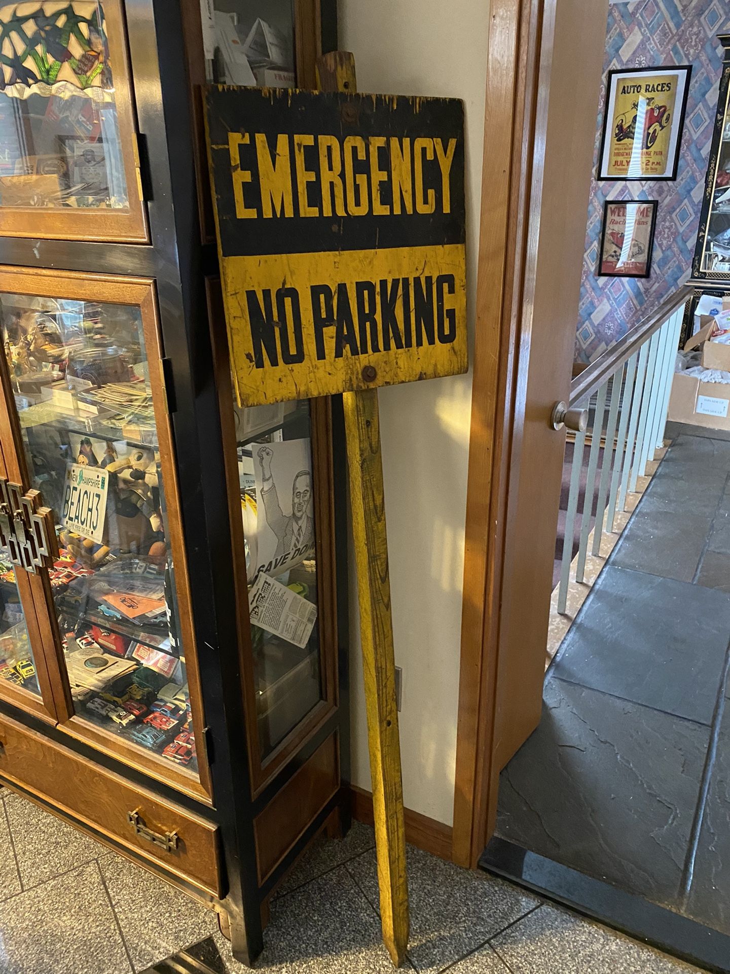 Original antique wood Emergency No Parking Sign . Measures 63” tall . Top sign part is 15 1/2” wide . Very cool piece !!!