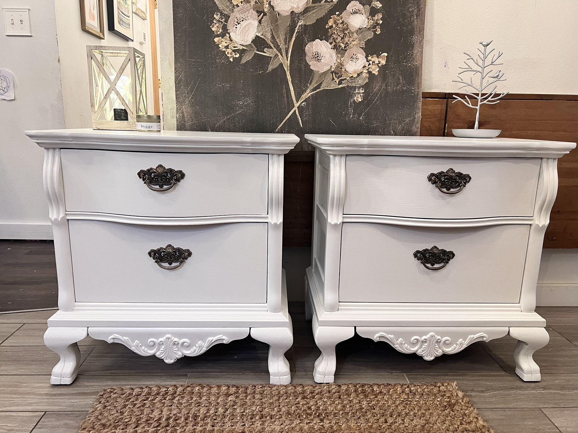 These are Lexington Furniture Victorian Sampler Collection wood nightstands made of red oak with tiger oak details Painted “Cozy White” Beautiful original brass drawer pulls Drawers lined with green olive leaf contact paper 26" High 26" Wide 18" Deep Smoke free home Smokey Point pick up Cash or Venmo End side tables bedroom living room storage bedside tables table cabinets cabinet night stand