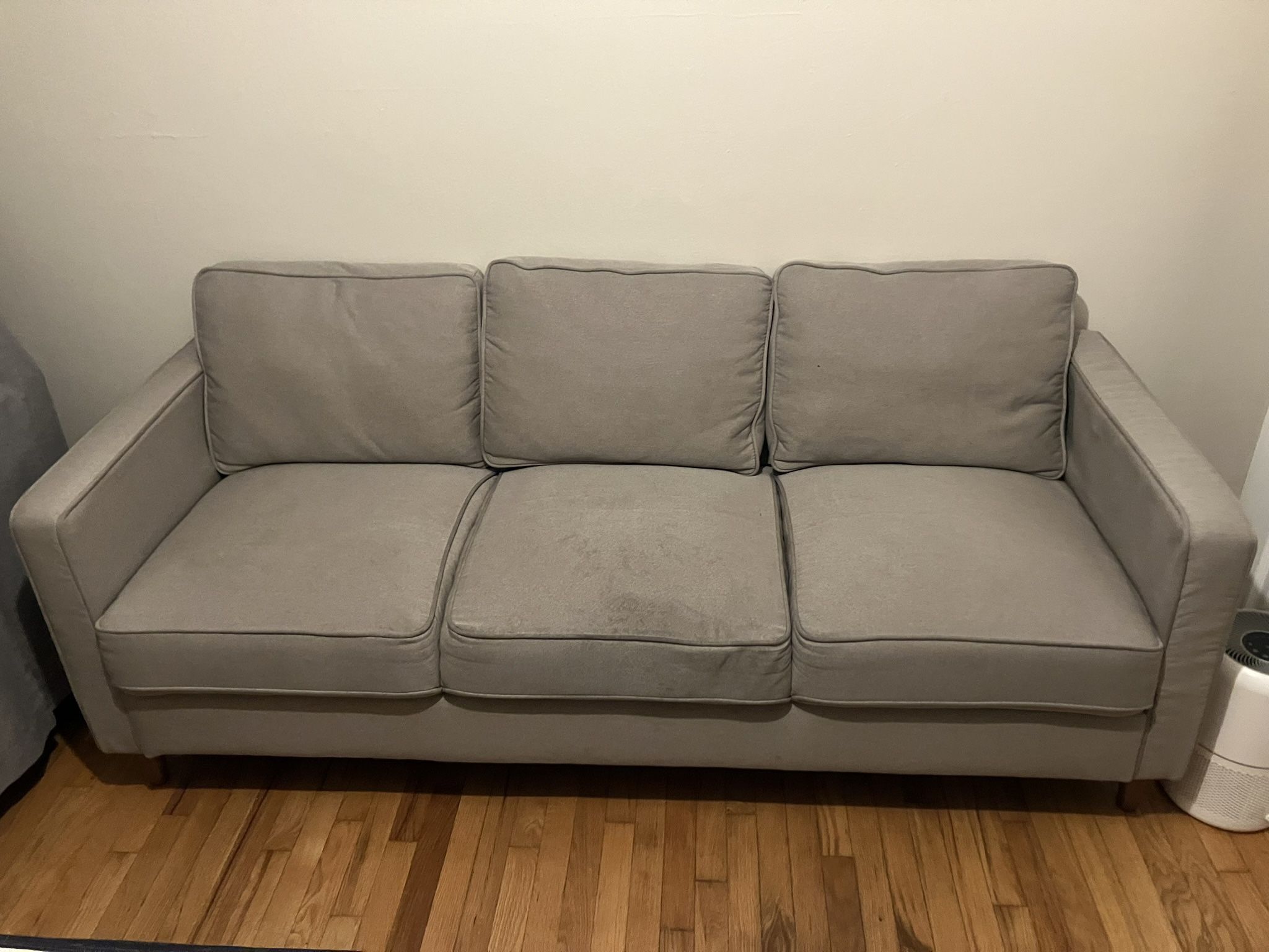 Grey couch from way fair, minor stains on middle panel- otherwise in great shape. Breaks down into 3 pieces( armrests slide off)