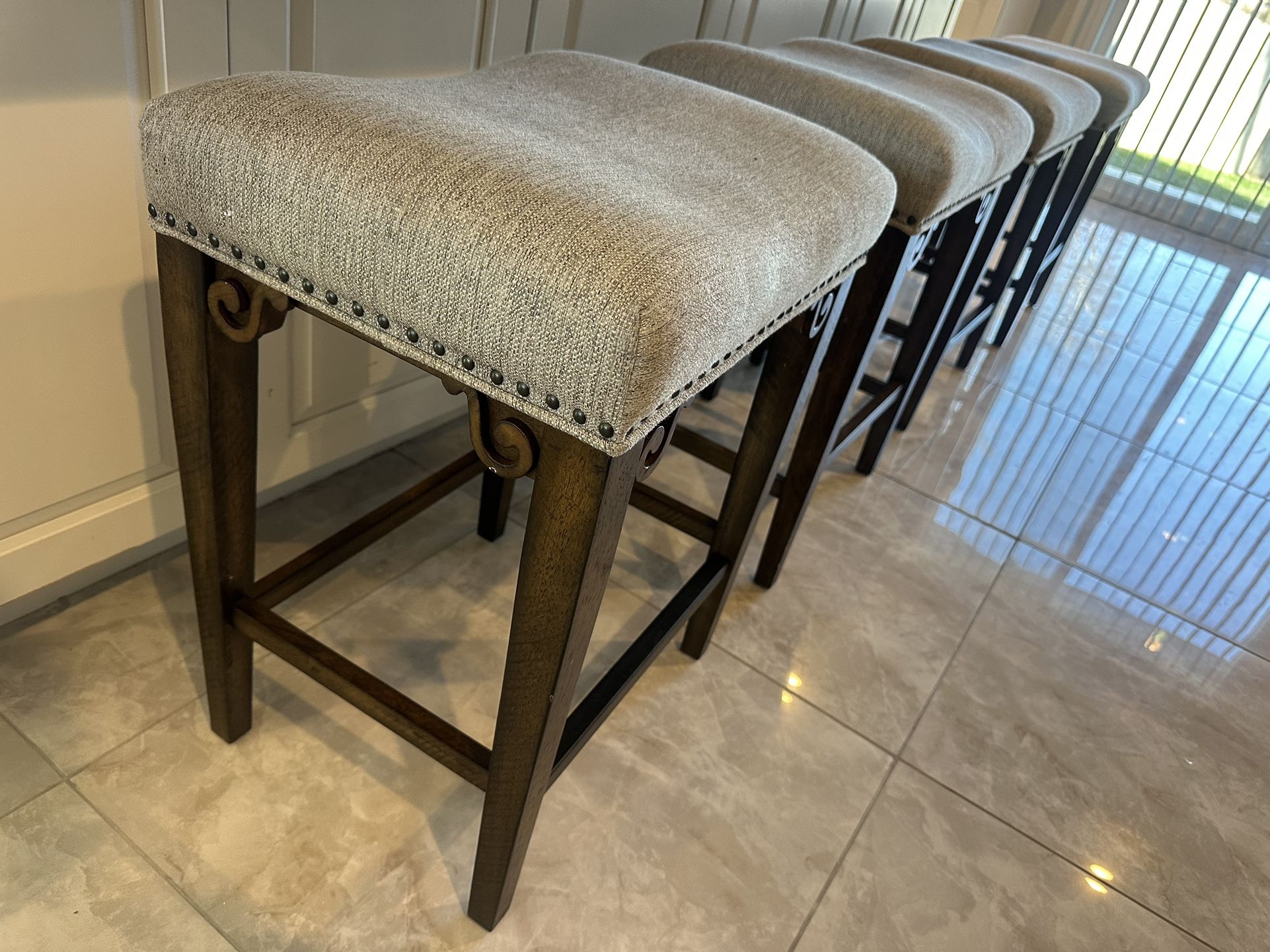 4 Upholstered Bar Stools – Stylish & Comfortable Elevate your kitchen or bar area with this beautiful set of 4 upholstered bar stools. Each stool features a soft, textured beige fabric seat with a subtle curve for added comfort, accented with decorative nailhead trim for a touch of elegance. The sturdy dark wood frame includes a footrest and scroll-style metal detailing underneath the seat for extra charm and support. Features: • Set of 4 bar stools • Upholstered in soft gray fabric • Comfortable curved seat design • Sturdy dark wood frame • Nailhead trim and decorative metal accents • Ideal for kitchen islands, breakfast bars, or high-top tables