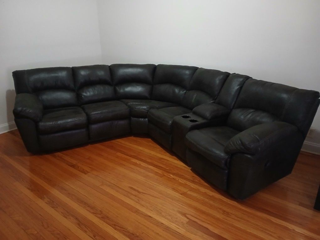 2 piece sectional pretty clean normal wear and tear. Right and left recliners pull out manually.
