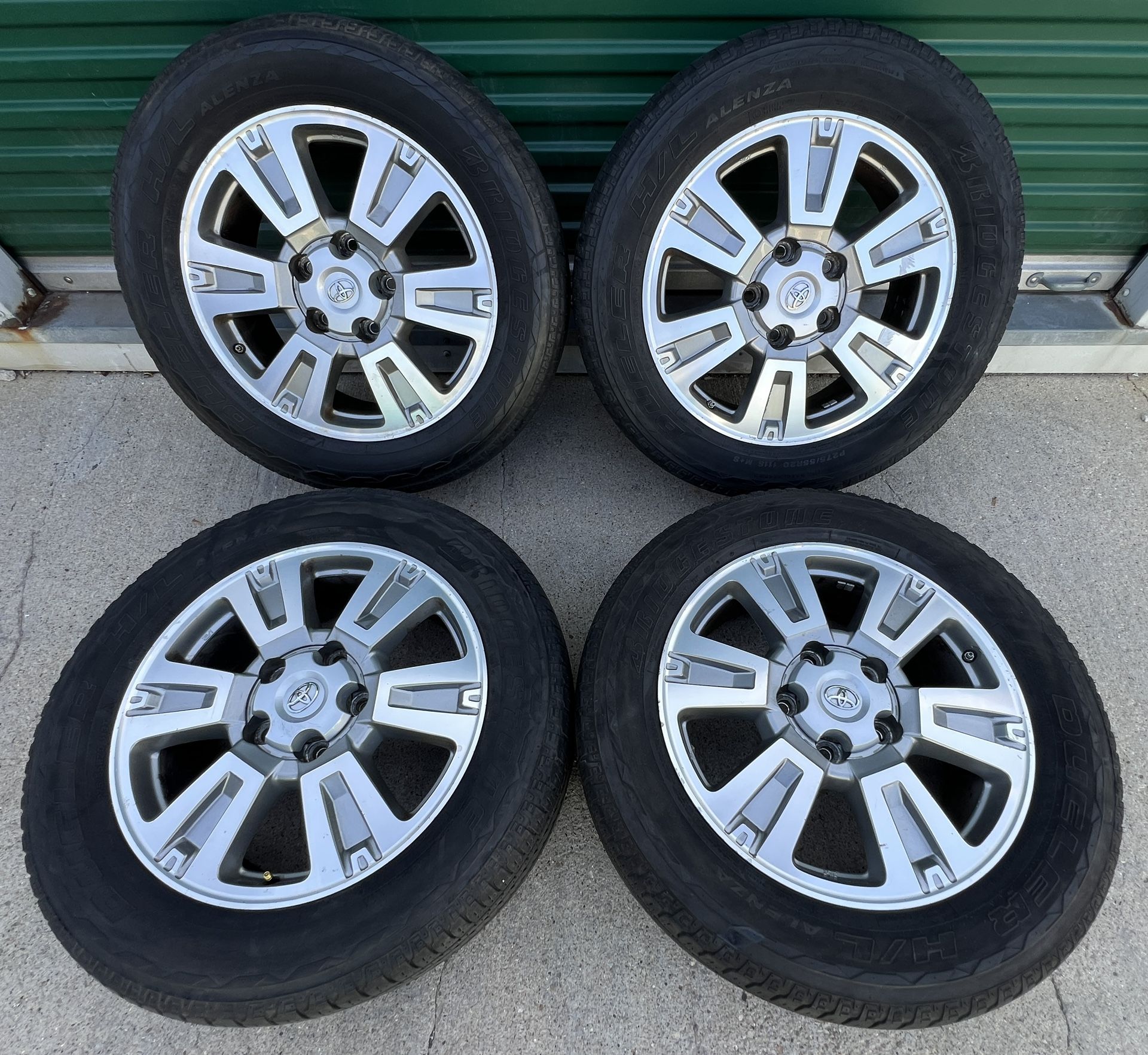 Selling a Nice set of: 20” Toyota Tundra Sport Sequoia Factory OEM Wheels Rims Tires 20 inch Wheels are in great condition. Tire Size/ Brand: 275/55/20 275/55r20 Bridgestone All Season Tires Tires have approx. 80% tread. Joe