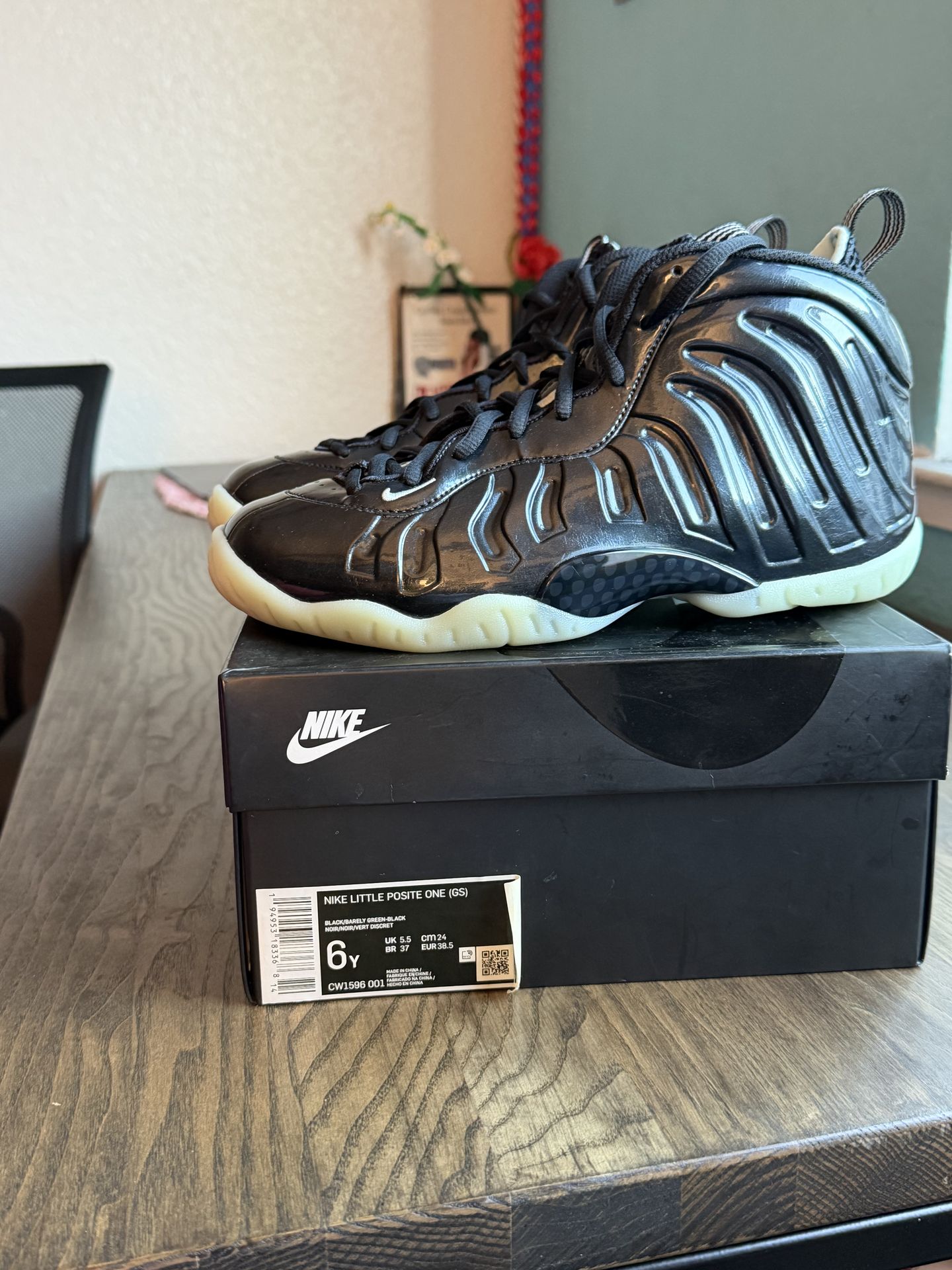 Cool Nike Little Posite One GS sneakers. Size 6Y. Black with a barely green sole. Comes with original box. Shoes look super clean, no scuffs or anything.