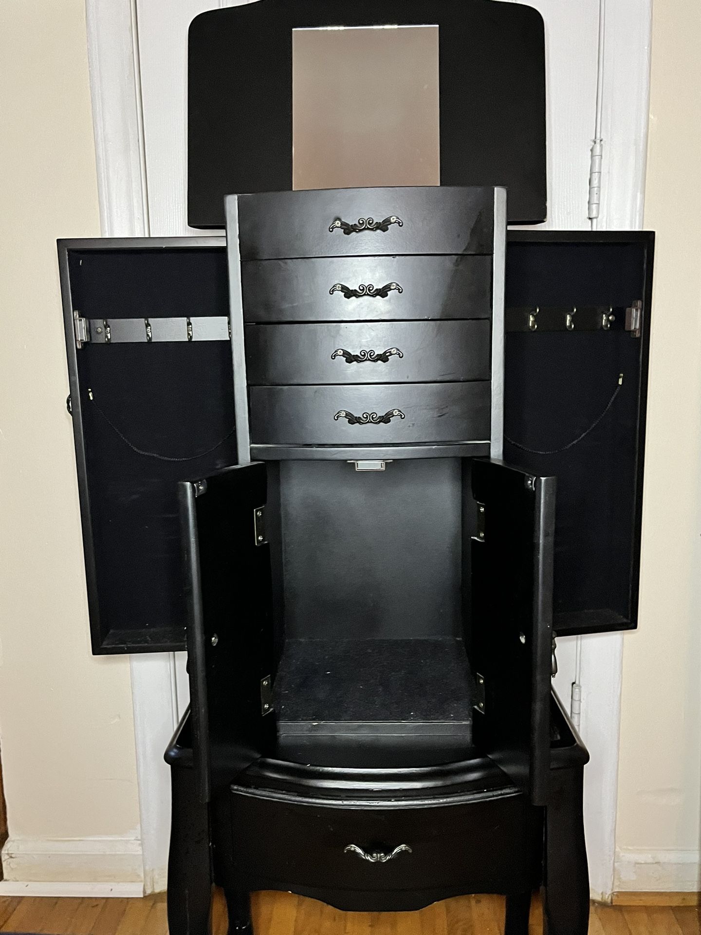 Black Jewelry Armoire with mirror, lightly/barely used, few minor scratches, lots of storage. Paid $199