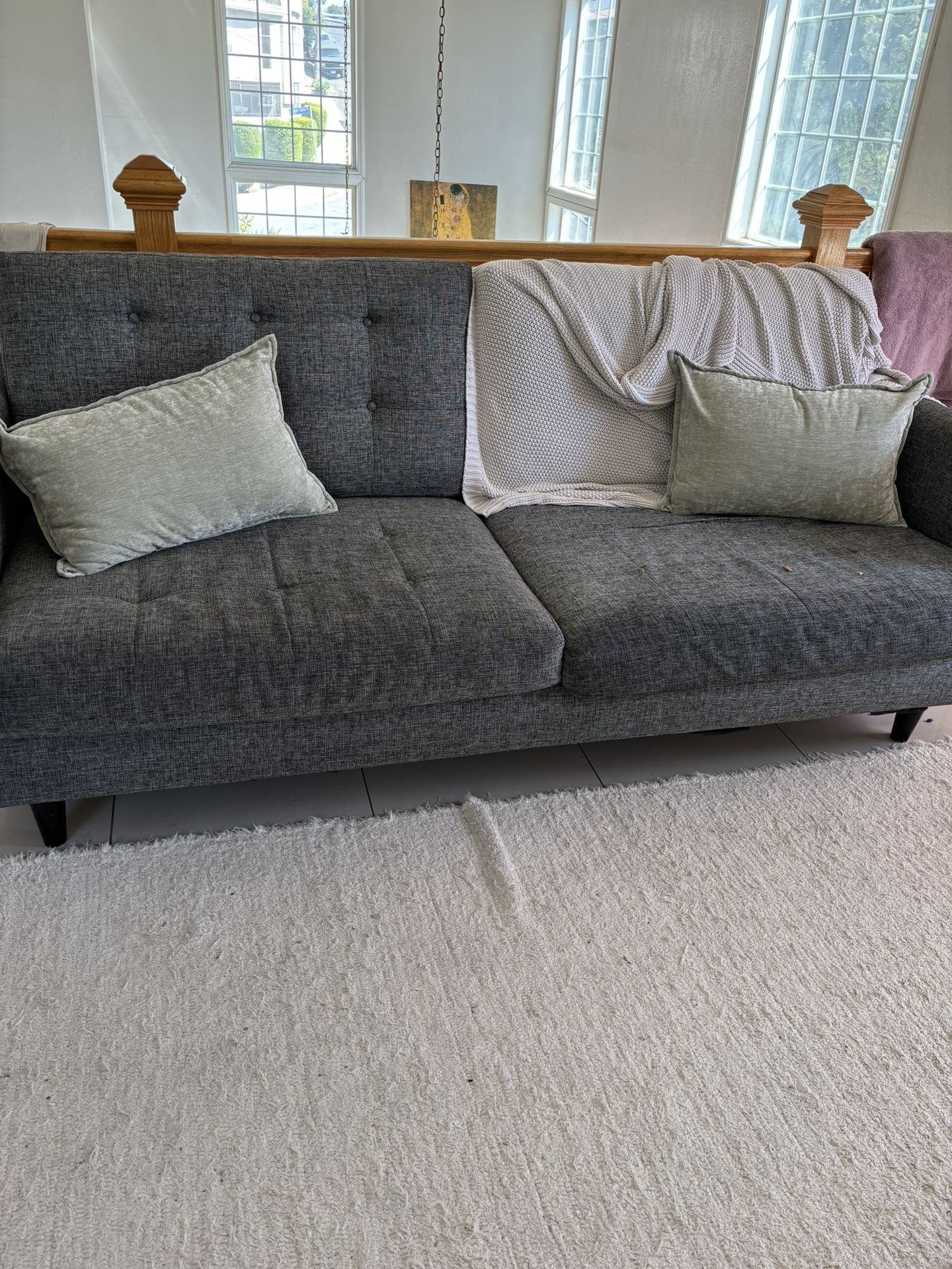 Gray fabric couch! No pets - no smoking. Super functional and comfortable for guests overnights because it’s only two seat cushions all soft edges. Removable back cushions makes it roomy for guests! Cushions are firm and deep- supportive no slouch issues and can be dressed up easily and fabric cleaned to look as new! Light and easy to move with two people and a van. Under fabric is ripped but can be taped up or reupholstered yourself if you choose to but it’s not visible. One seat cushion has a zipper torn so you see the foam when moving but it’s hidden from view. Great neutral color to add your accent pillows to.