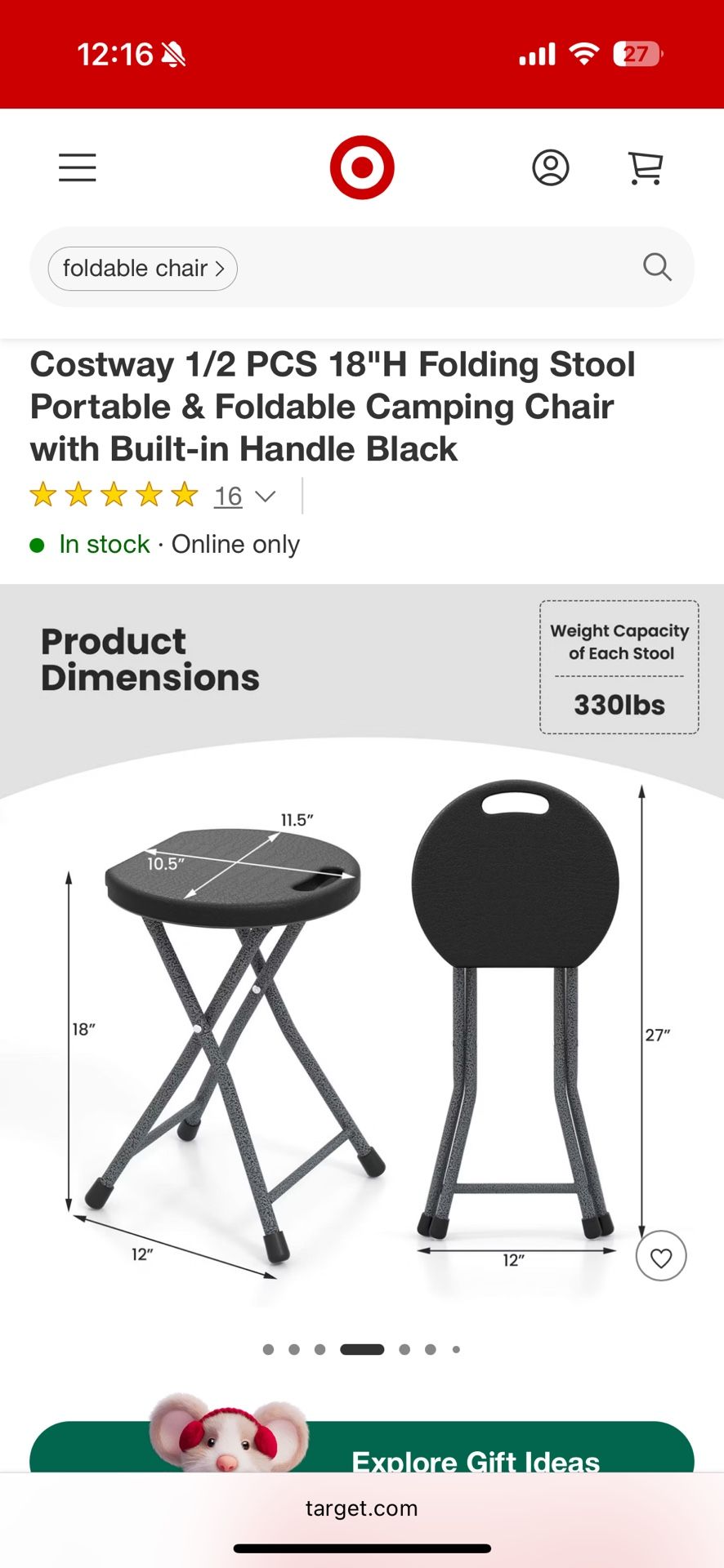 Costway 1/2 PCS 18"H Folding Stool Portable & Foldable Camping Chair with Built-in Handle Black