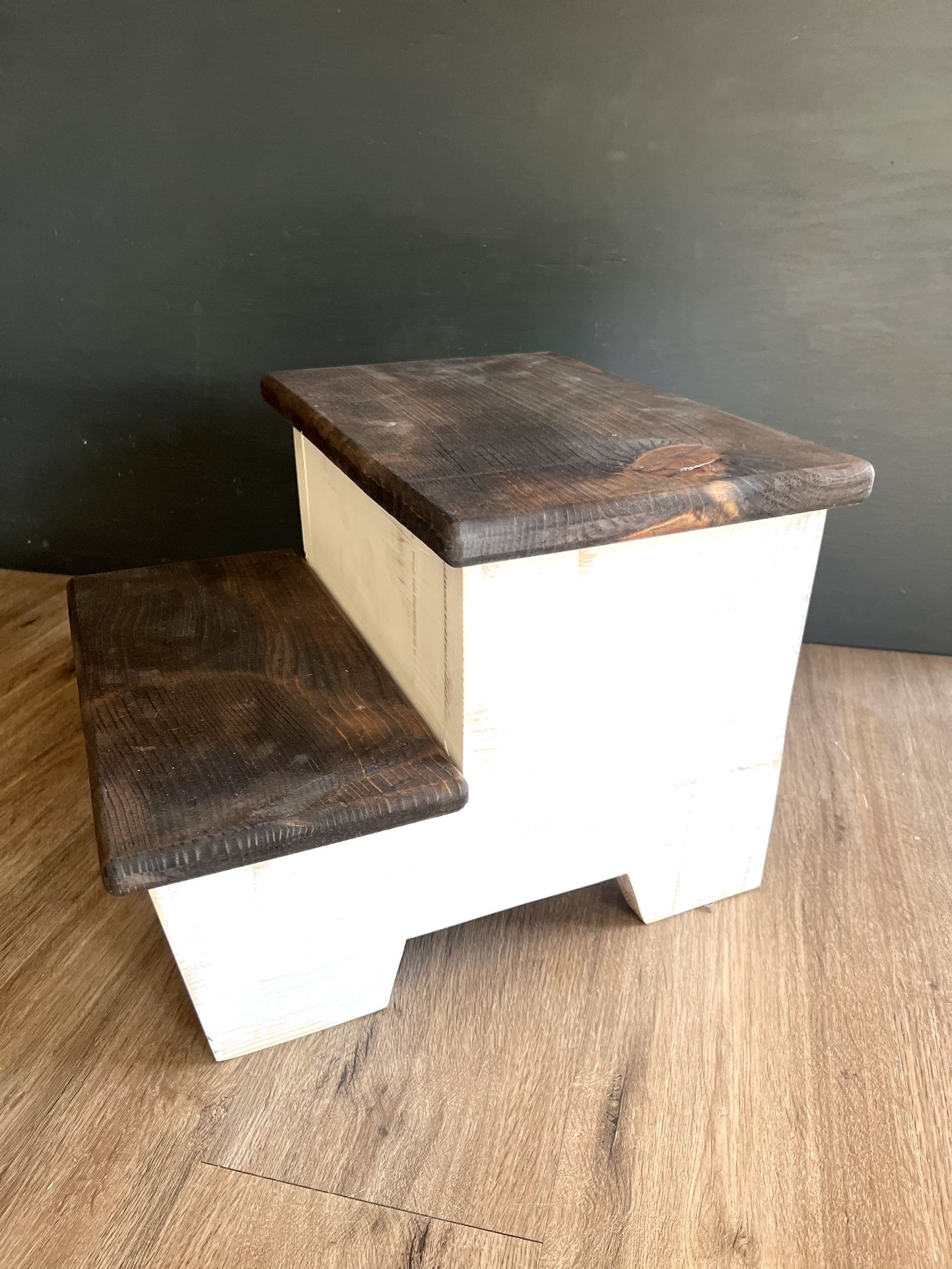 Custom handmade step-stool. Walnut stained steps white antiqued sides. 9” H x 15.5” W x 16”D. Can make different stains and colors on order. Contact for more info or best offer