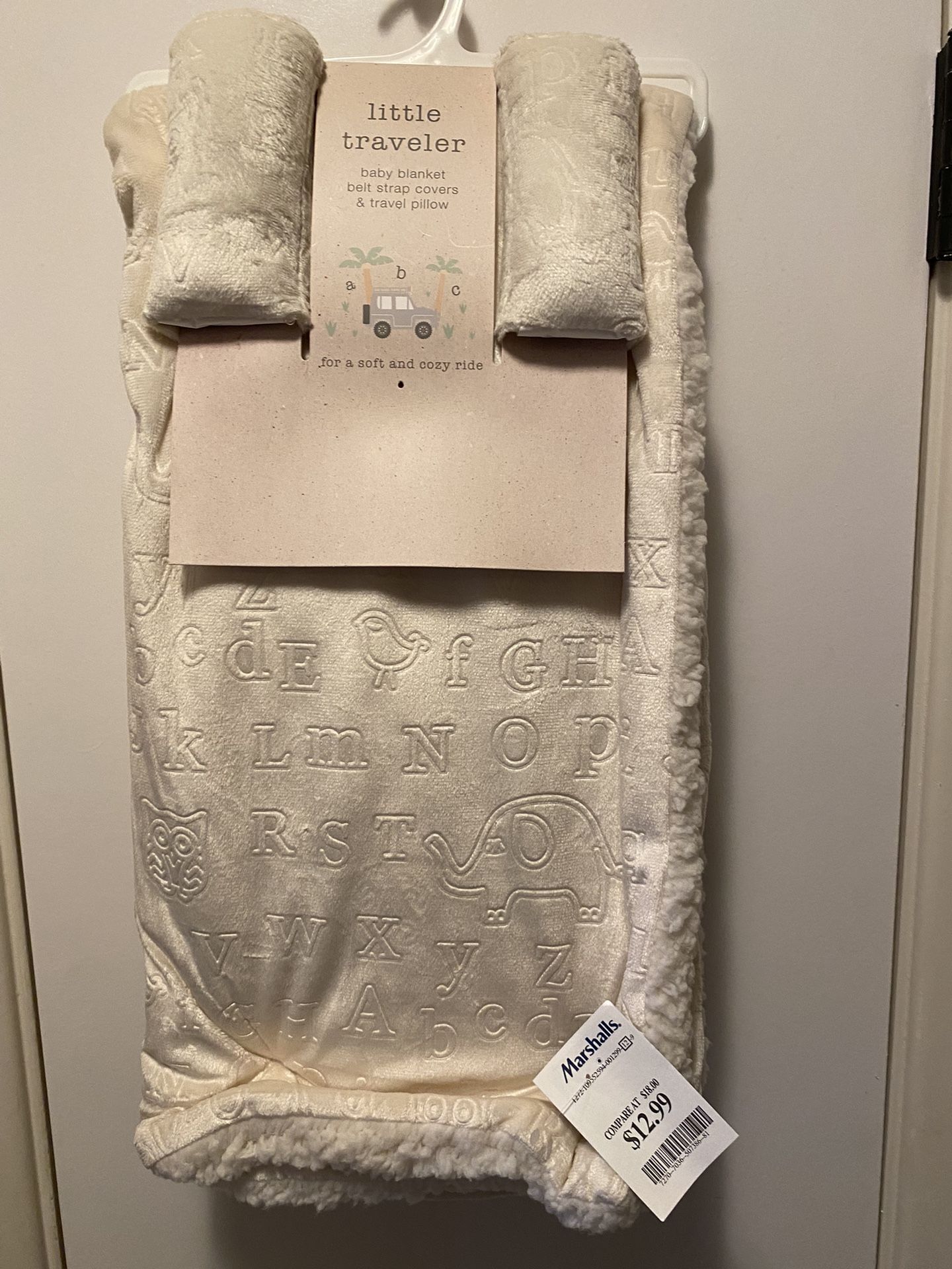 This is a brands new baby blanket from Marshall’s. It was a three-piece set, but my mom only wanted the little headrest. It is a very pretty light beige. It came out kind of gold looking in the photo, but it’s not. So it is a brand new blanket and a set of straps for a car seat. Only asking eight dollars. I am at 56 Street and Thunderbird see my other offers.