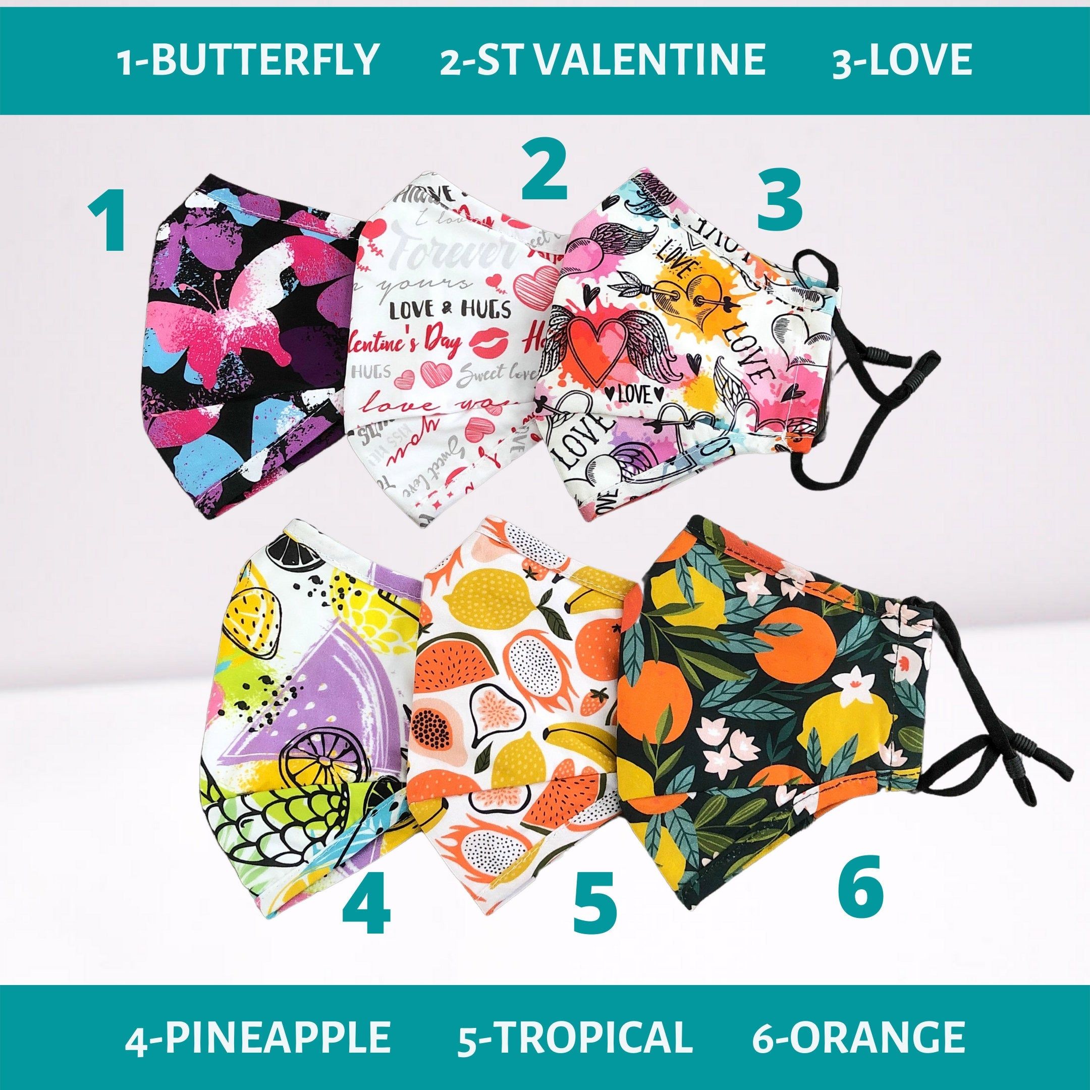 This is a perfect gift for your loved ones!High Quality Cloth Face Mask for Adults- Cute St. Valentines day prints- Washable and reusable cloth mask- Filter pocket on the back- Adjustable elastic ear loops/strap, nose wire- Made with 2 layers of cotton- Breathable and comfortable to wear- Fits to most adults and teens face - Perfect for women What is included:- One Adult Size Face Mask (5.5" x 8")- 1 Replaceable Filters (5-layer PM2.5 Activated Carbon Filters)- FAST ShippingShips in 1 business day from Los Angeles, CA! After it is shipped, it takes 2-6 business days to be delivered in USA.Please Note:1. Hand wash or delicate wash is recommended for the mask. (Filter is not washable)2. Due to hygiene reasons, this item is non-exchangeable and non-returnable.3. The mask is not FDA-approved, not intended for medical use, and not proven to reduce the transmission of disease.