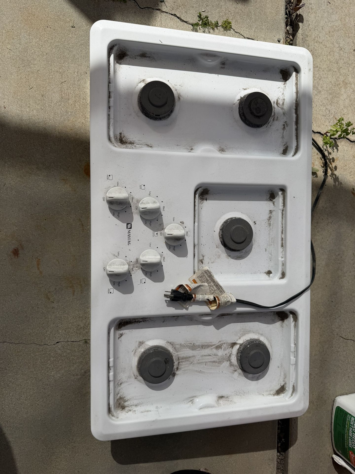 Maytag. White gas stovetop. We took it off our kitchen when it was remodeled last year. Still works great. A little dirty has been in the shed. But will clean. Very sturdy ready for new life. Price is 100.00 Can deliver for a fee. Thanks