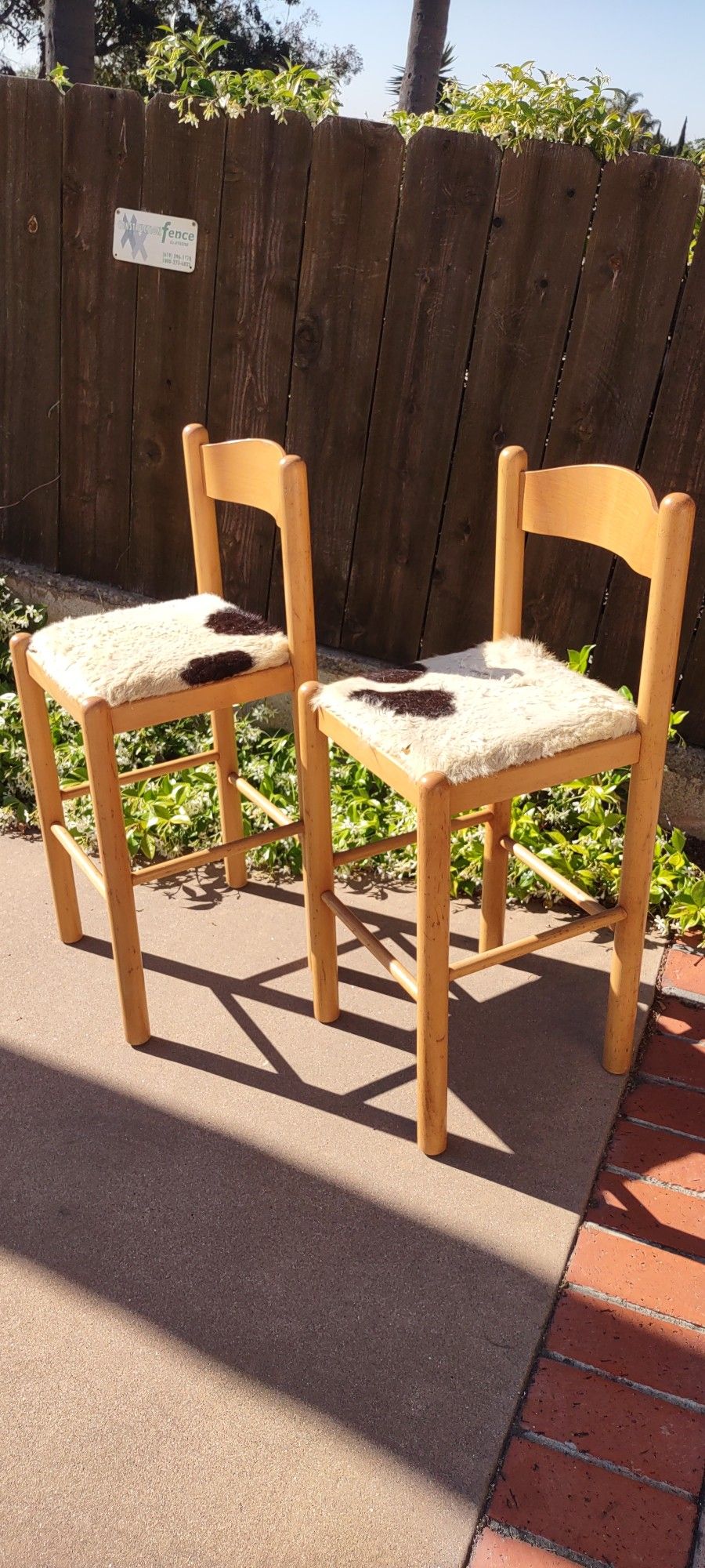 Cute set of Bar Chairs. Blonde wood - good condition Cowhide seats - see pics for condition Sturdy and solid $50 for the set