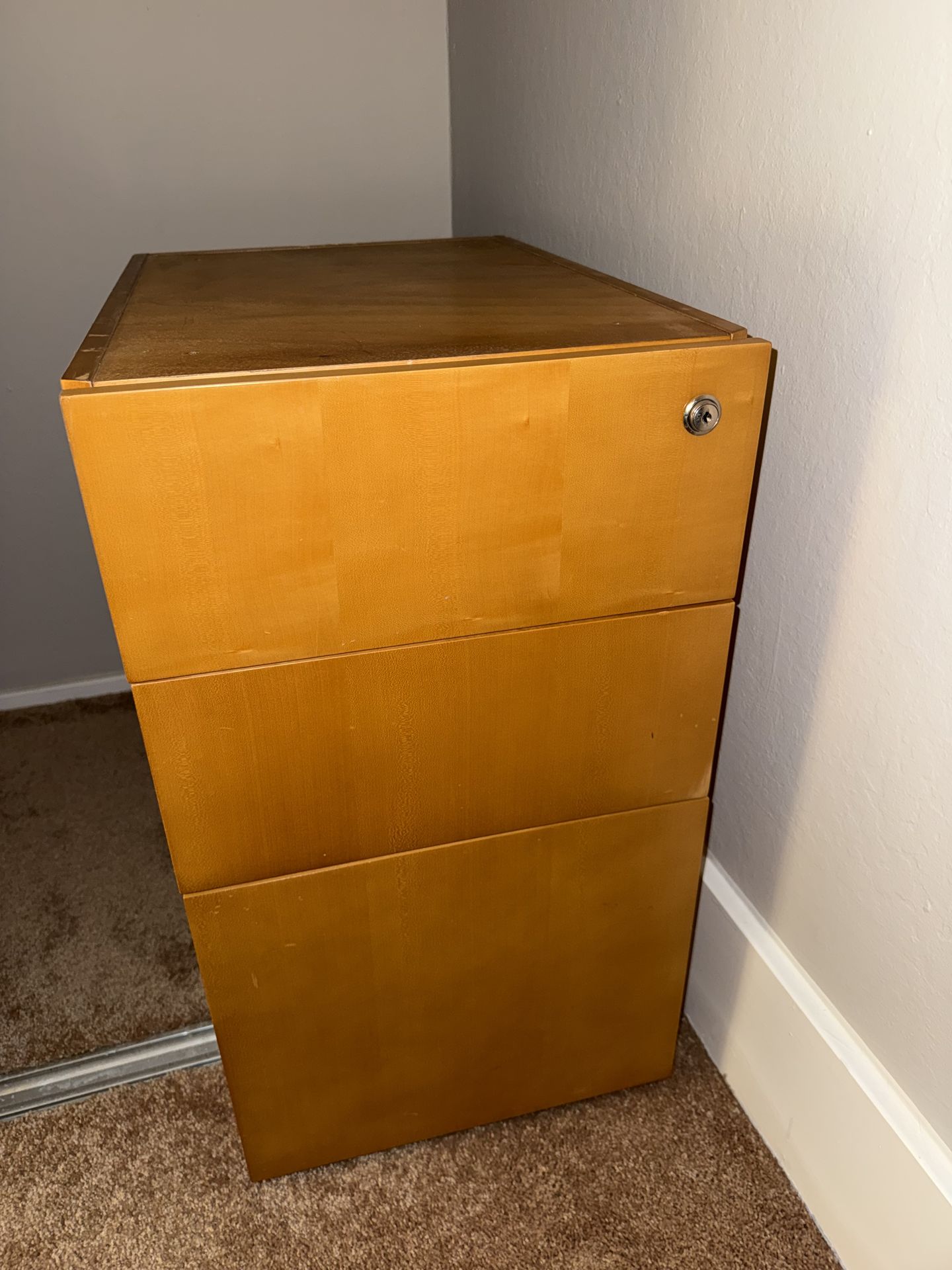 Three-drawer wooden filing cabinet with lock (no key). Also 10 hanging files