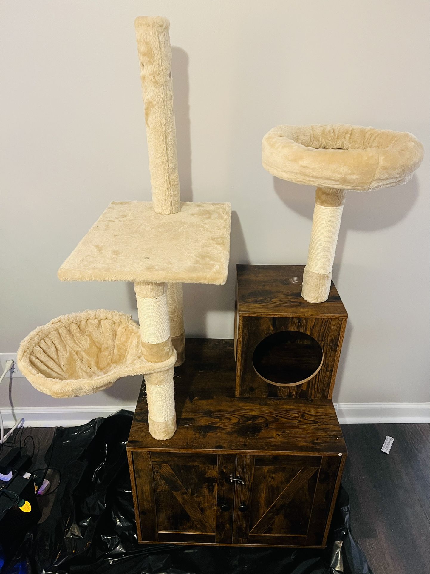 Dimensions approx. Bottom base - 24”x20” Height(with attachments) 5’ Still in good shape. Has a a litter box enclosure. Too large for small house need gone asap.