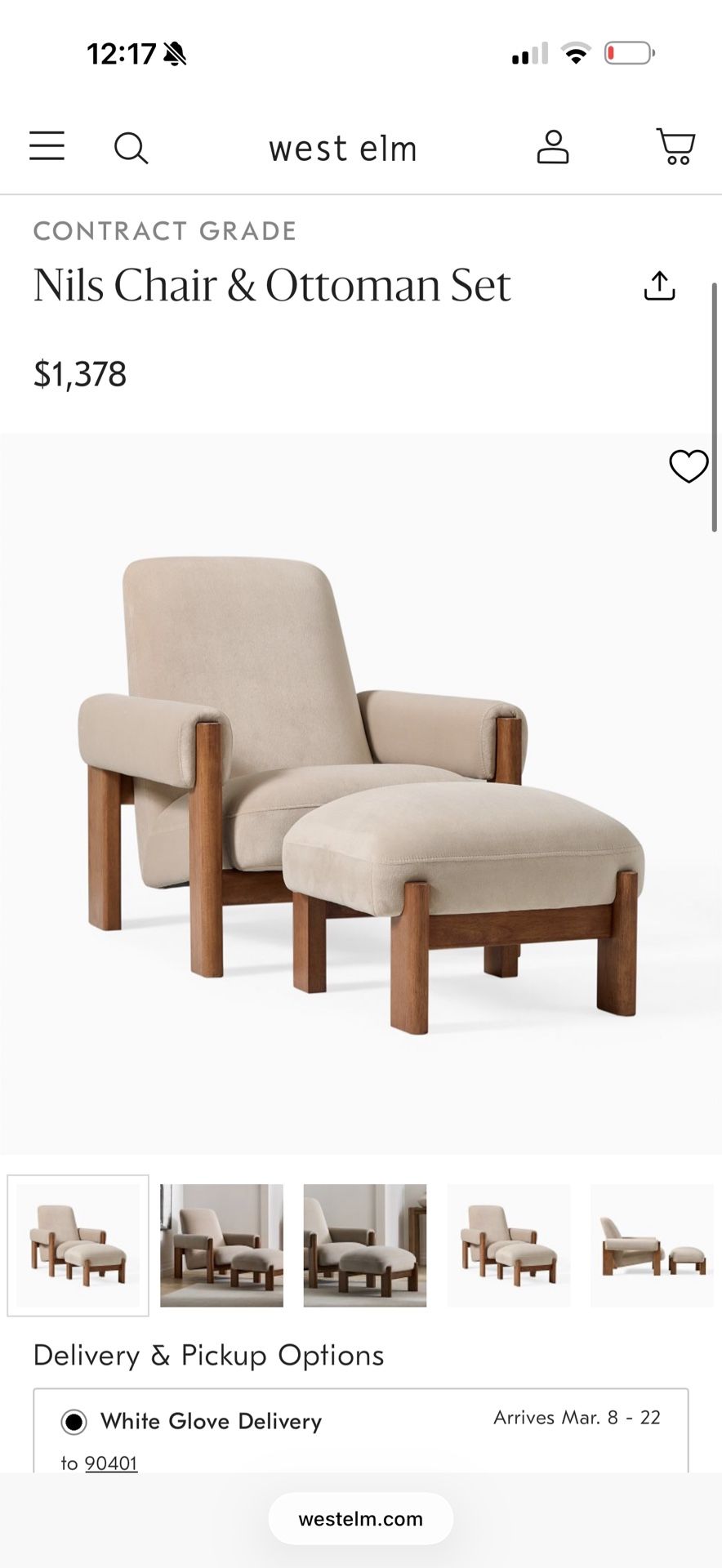 $888 — Full price still listed on West Elm. Please, no low offers. It’s brand new. Gently used, brand new, chair + ottoman set.