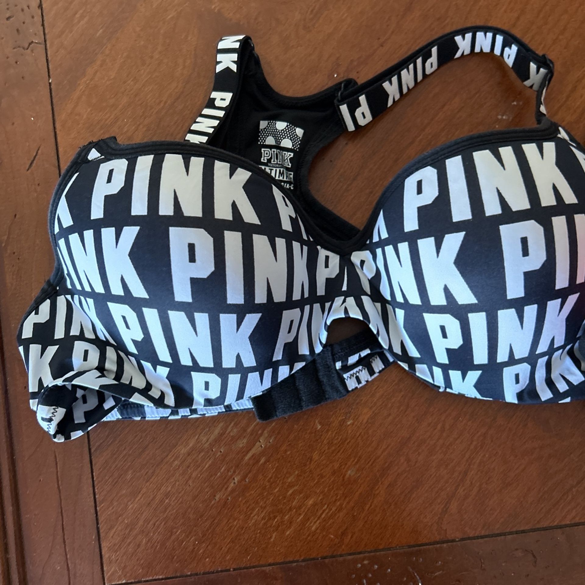 Nwot. Pink! Black-and-white with the pink logo all over this exercise bra. Was washed and laid to dry. Size large fits An A through C cup. Can accommodate a size D cup, but will definitely spill over with the push-up feature. Chest size 34 to 36 with adjustable strap on back. This is definitely a push-up bra! Smoke free, pet free home. no rips stains or tears anywhere on the bra. Item is located in Morristown Tennessee. Can ship nationwide.
