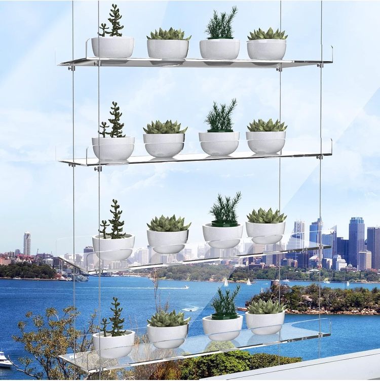 ADJUST HEIGHT FREELY:Acrylic Shelf Size:16’’Long, 6" Wide, 1" Deep,4-Tier Cable is 60’’. The hanging window shelves could hold about 20 pounds each tier nicely. so you can display a variety of plants of different sizes.and easily adjust the spacing with screw to get the most suitable spacing for windows and plant growth. HANGING SUPER CLEAR PLANT SHELVES:4-Tier clear acrylic hanging window plant shelves. the transparent design allows natural light to pass through and provides rich sunlight for indoor plants with a sunlight transmittance attain 95%, maximizing the amount of sunlight that reaches your plants. This makes them ideal for use in spaces that may not receive a lot of natural light, such as basements or apartments, as well as for use with plants that require a lot of light to grow.