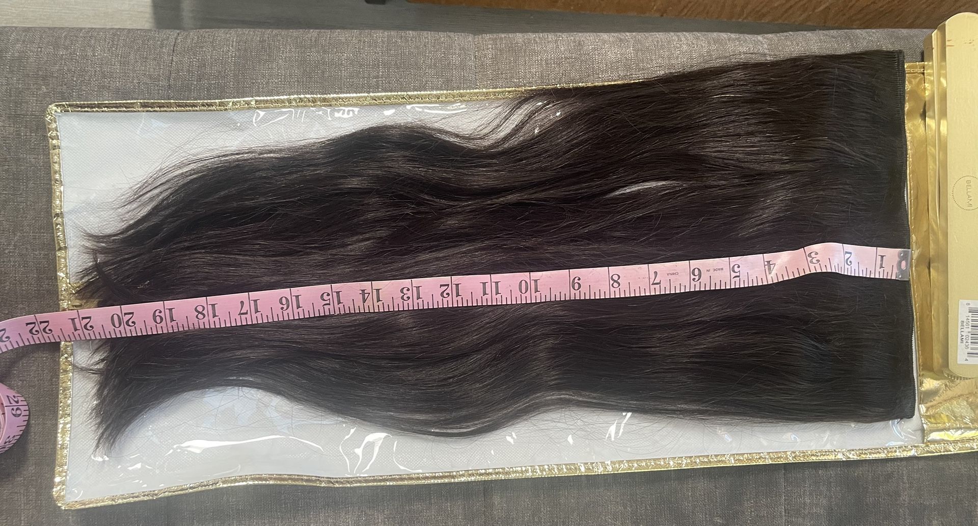 They were 22” originally but I trimmed them to match my length. Comes with storage. Beautiful luxurious hair. Don’t know the grams but a nice hand full, very THICK. $200 firm when you feel them you will know.