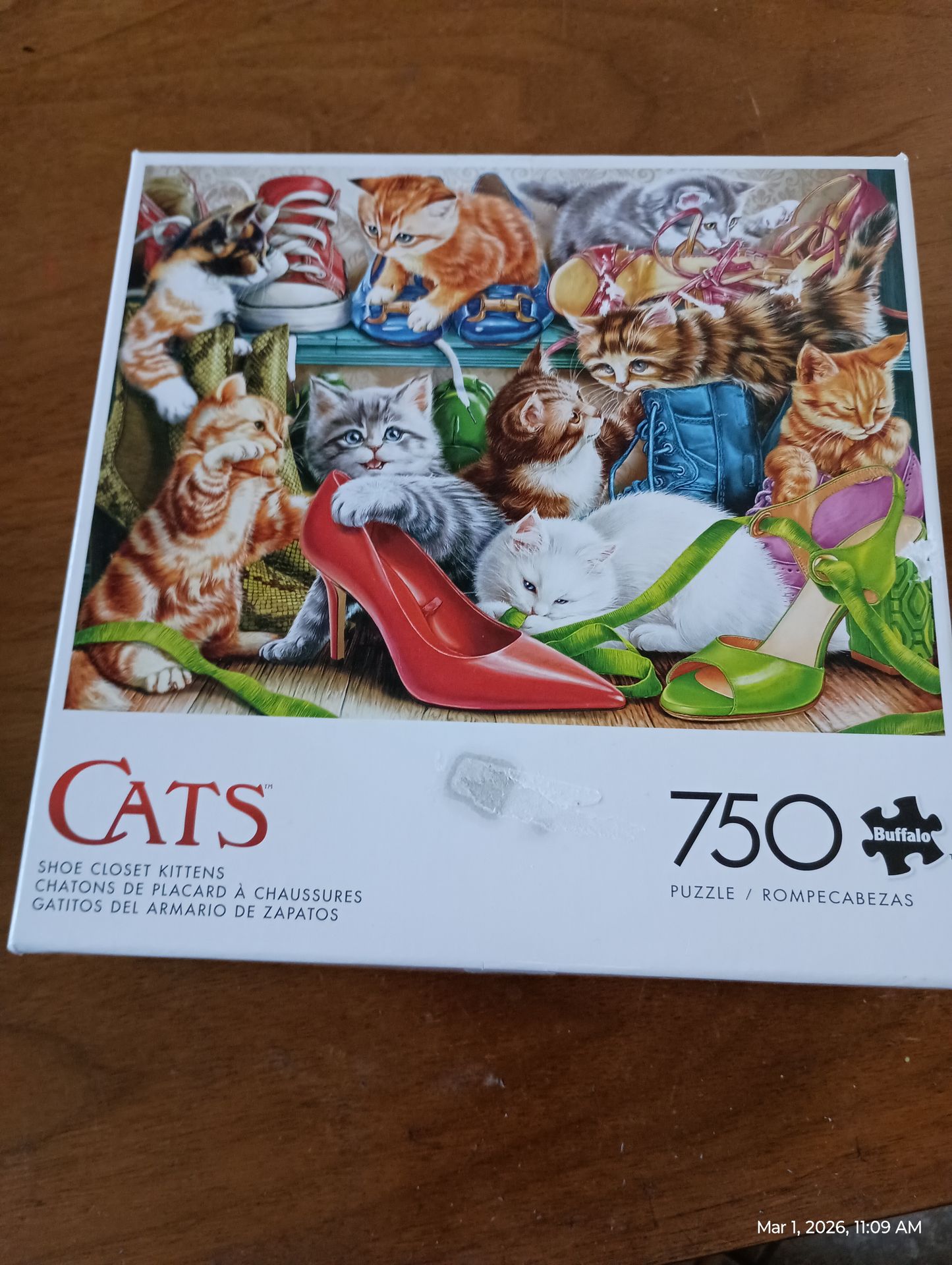 Buffalo Cats Shoe Closet Kittens 750 Piece Jigsaw Puzzle Cute Buffalo Games 750 piece jigsaw puzzle. Has adorable kittens playing in shoes. All pieces