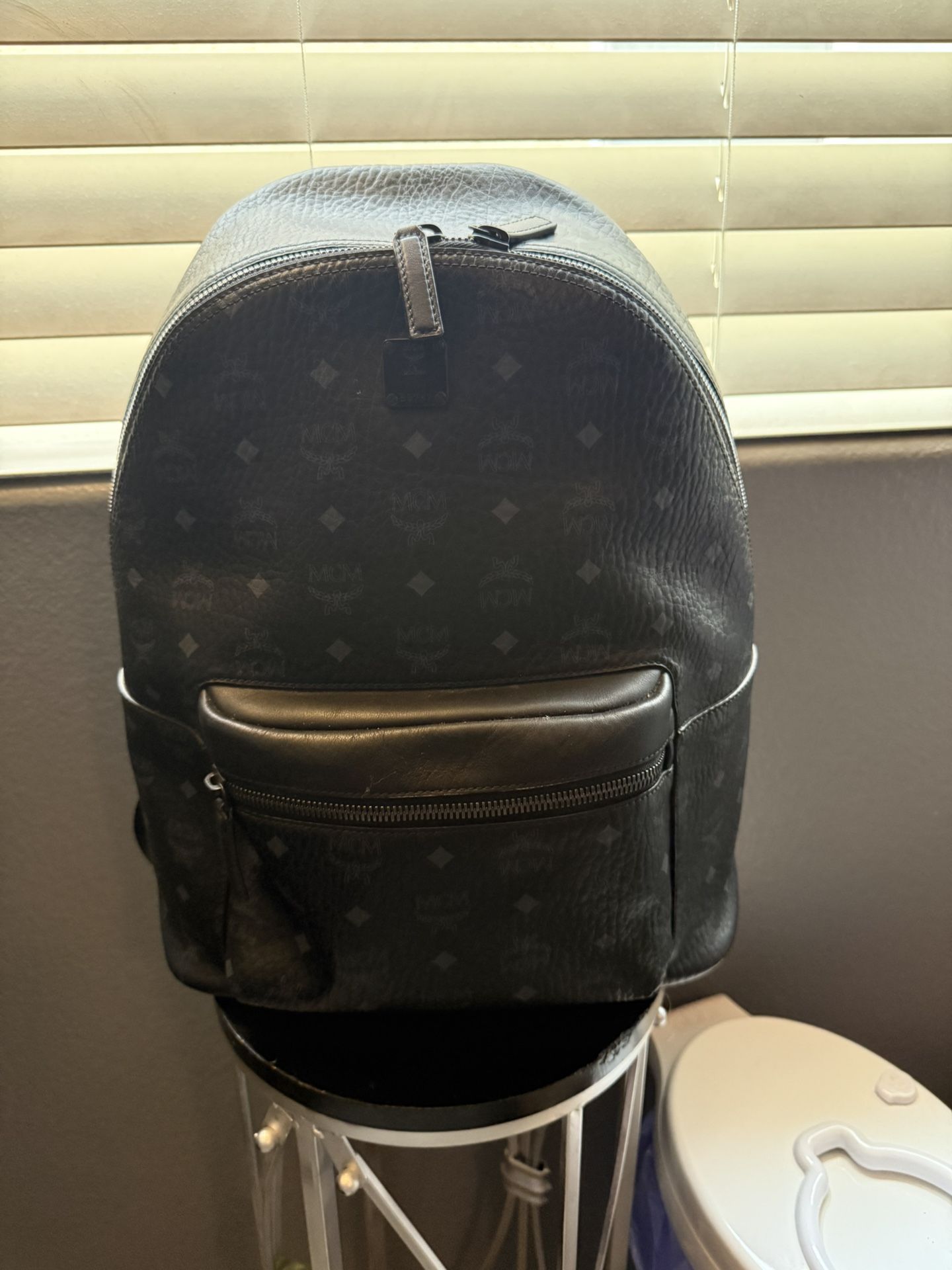 Authentic MCM backpack in black Visetos monogram coated canvas with black leather trim. Features front zip pocket, top zip closure, adjustable straps, and signature MCM logo plate. Exterior is in good condition with normal wear and light creasing from use. All zippers function smoothly. Interior has visible ink stains from a pen that burst inside. Stains do not affect functionality but are reflected in the price. Great everyday designer backpack — perfect for someone who doesn’t mind interior cosmetic flaws. Open to reasonable offers.