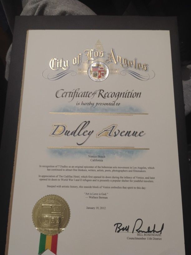 AUTHENTIC CITY OF LOS ANGELES, CERTIFICATE OF RECOGNITION, SIGNED BY BILL ROSENDAHL, JANUARY 19th, 2012. 7 DUDLEY AVENUE, IS THE OFFICIAL SITE OF THE CADILLAC HOTEL, SITE OF THE BOHEMIAN ARTS MOVEMENT IN L.A., OPENED ITS DOOR'S IN 1914. OWN A GREAT PIECE OF LOS ANGELES NOSTALGIA. AWESOME GIFT IDEA FOR ASPIRING ARTISTS, WRITERS, POETS, PHOTOGRAPHERS, AND FILMMAKERS. $100.00 FRAMED, $80 WITHOUT. NO SHIPPING, NO DELIVERIES. ACCEPTING PAYPAL, CHIME, AND VISA.