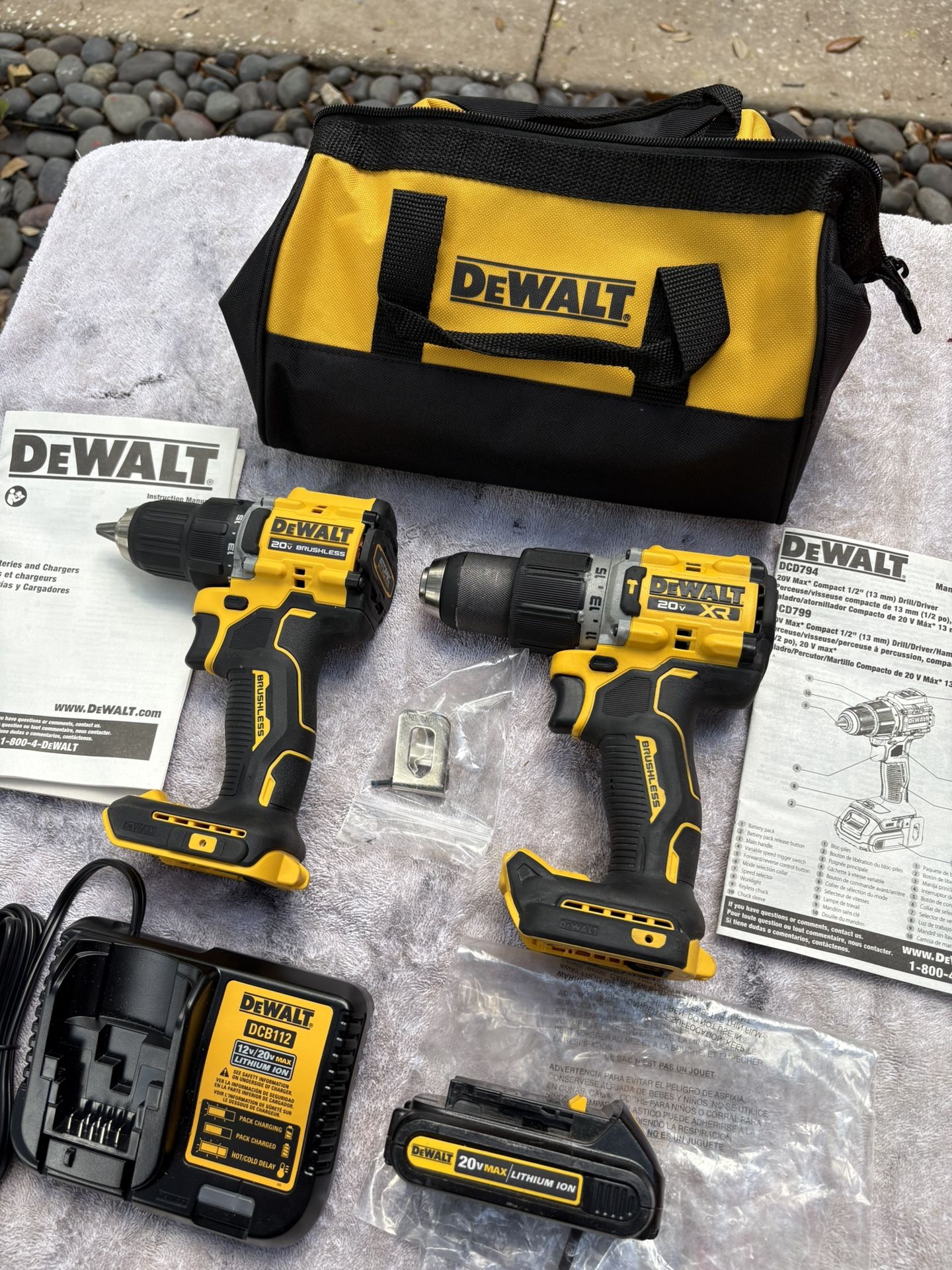NEW/UNUSED DEWALT 20 V MAX XR BRUSHLESS DRILL COMBO KIT—DCD794 1/2” Drill Driver & DCD805 1/2” Hammer Drill, Battery/Charger
