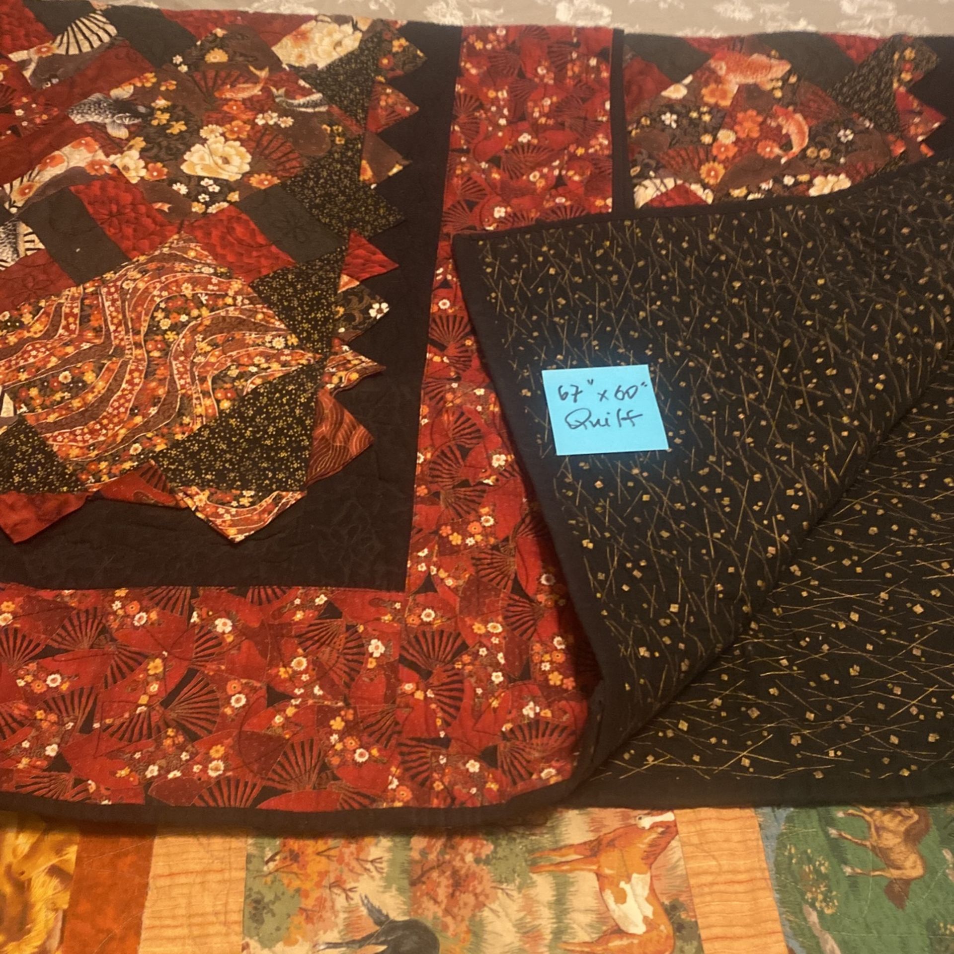 Can use both sides of this quilt. It is a 67 x 60.