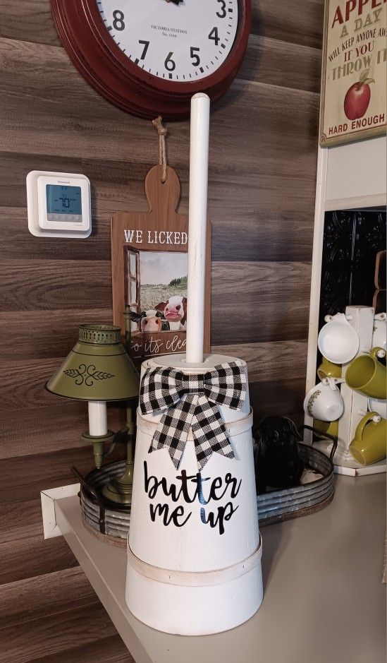 Cute country farmhouse style wood butter churn. $30. Painted white and lightly distressed. Vinyl butter me up decal. Measures about 28" total height. See pictures for other measurements so you'll be aware of it's size. Located in Maiden for pickup on Clayton Lane or can meet at the Hardee's on Startown Road in Maiden or the Dollar General on Aspen Street in Lincolnton.
