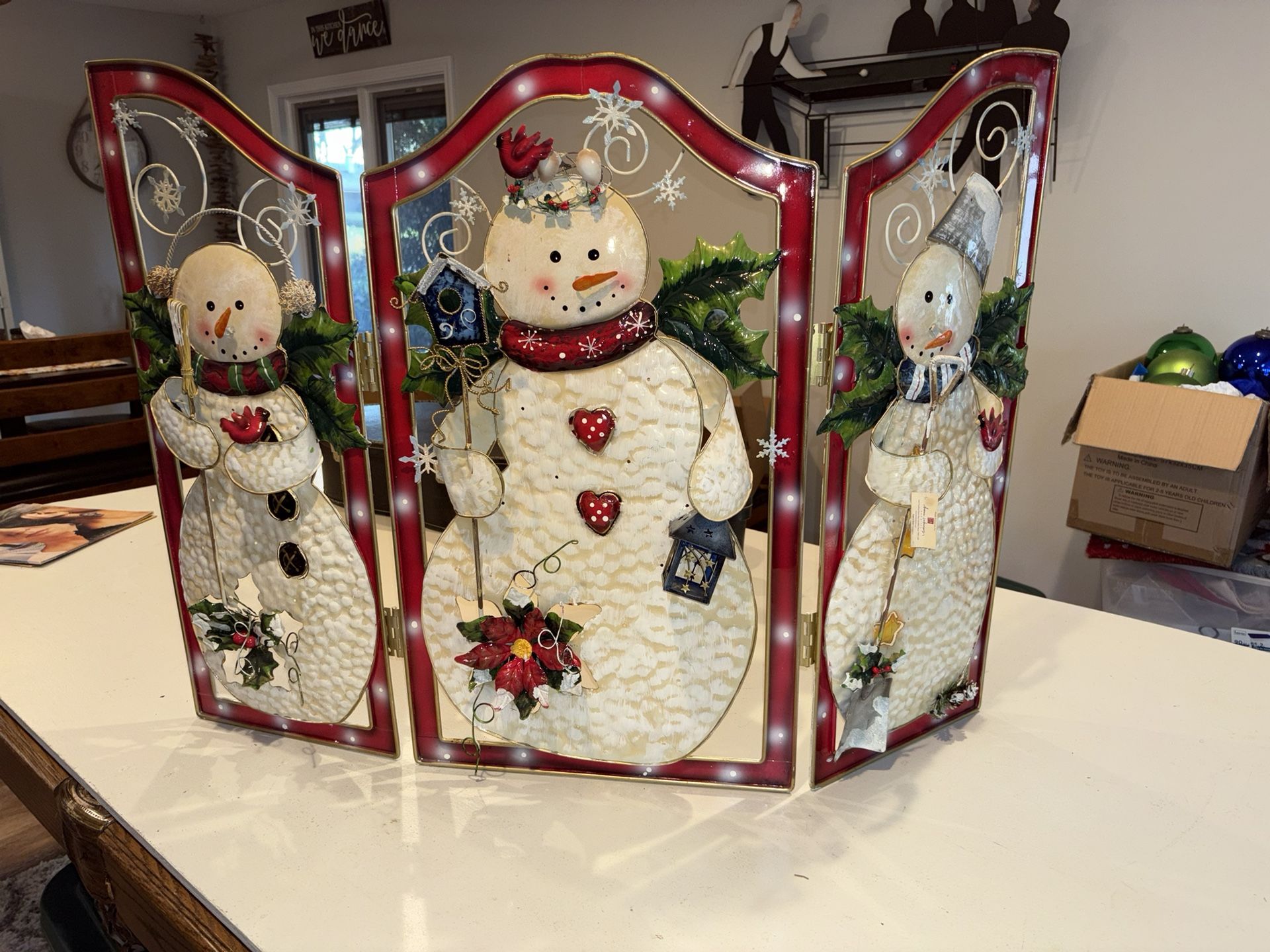 Brand new still has the tag on it Vintage Christmas fireplace screen made by Home interiors 3 ornate Frosty the Snowman beautifully decorated