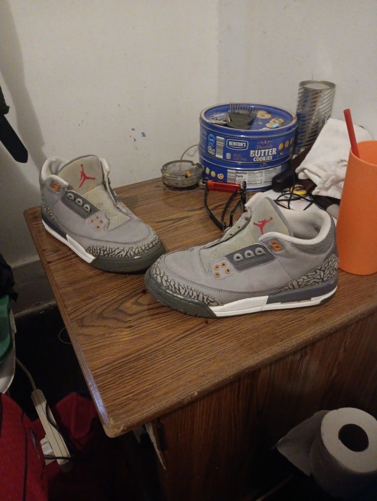 Used a Lil wear in tear cool gray 3s size 5 and pink and white size 6 alot better in person have to see em some wear no tear or rips cleaning the now have shoe laces asking $130 for both just cool grays $70 and just pink 3s $50 come get em