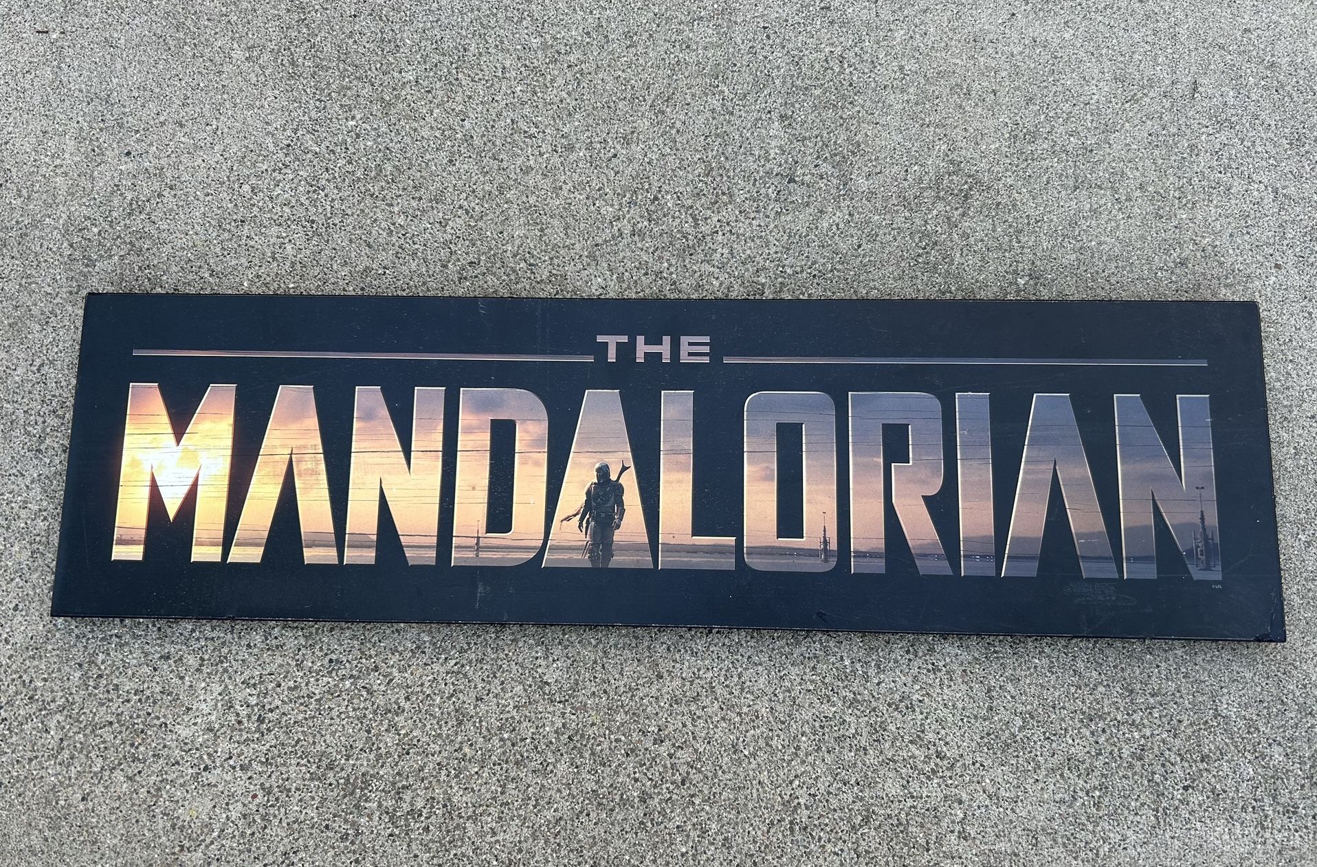 This is a sign or plaque featuring the logo for the Disney+ TV series The Mandalorian and measures 28 inches by 8 inches. The bottom right corner has been touched up. The design is based on the title logo for the popular Star Wars show. It appears to be a decorative item for display, potentially 3D printed or a similar type of merchandise. The text "THE MANDALORIAN" is prominently displayed vertically with a sunset/landscape graphic fill. The logo includes a small silhouette figure of the main character, Din Djarin, within the letters.