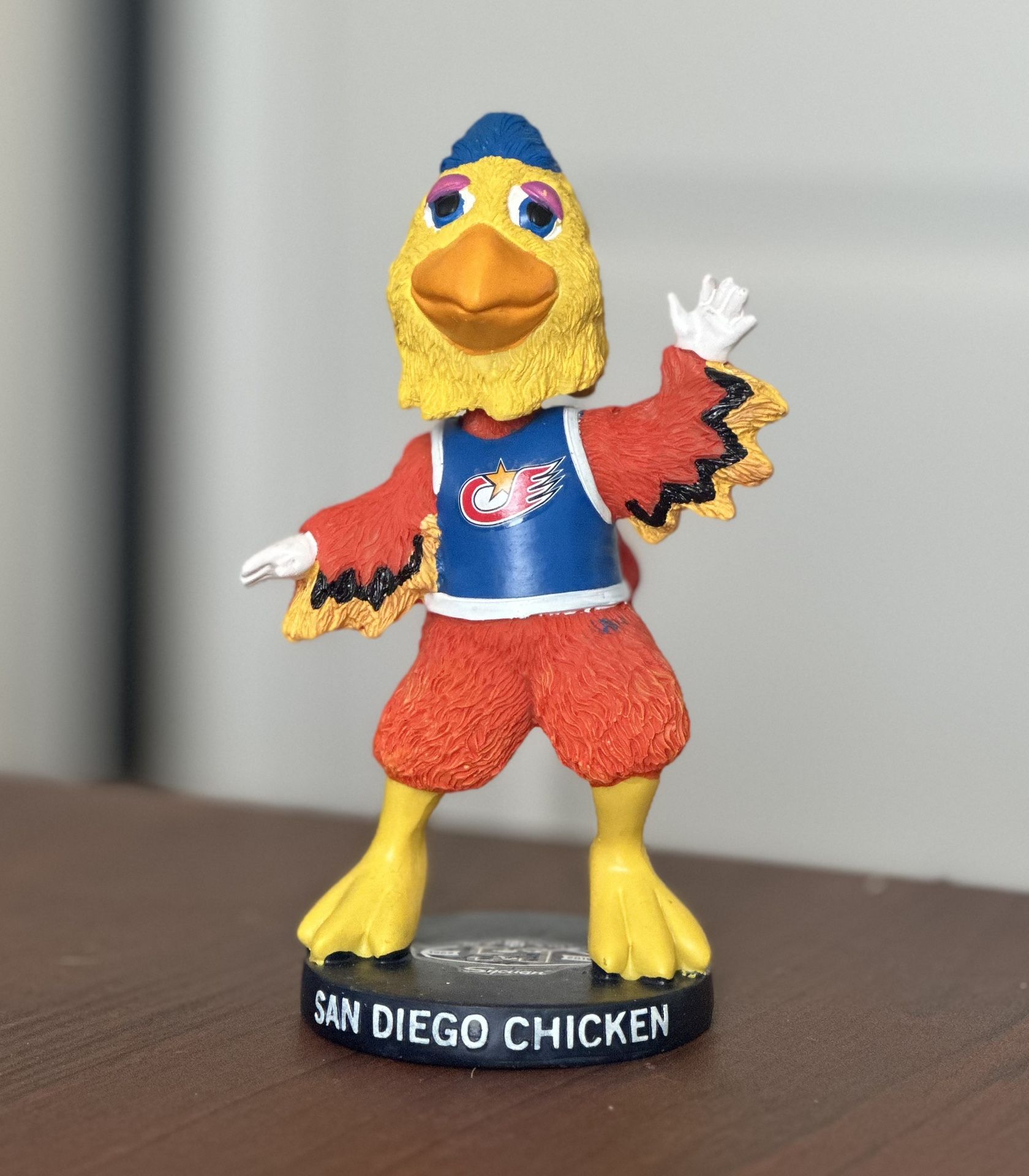 Looking for a bobblehead piece to add to your collection? This is it, the San Diego Chicken is an iconic mascot here in San Diego? This promo item is from July 27, 2019. This is NIB (New In box). This collectors piece needs a home and will be a nice addition to display.