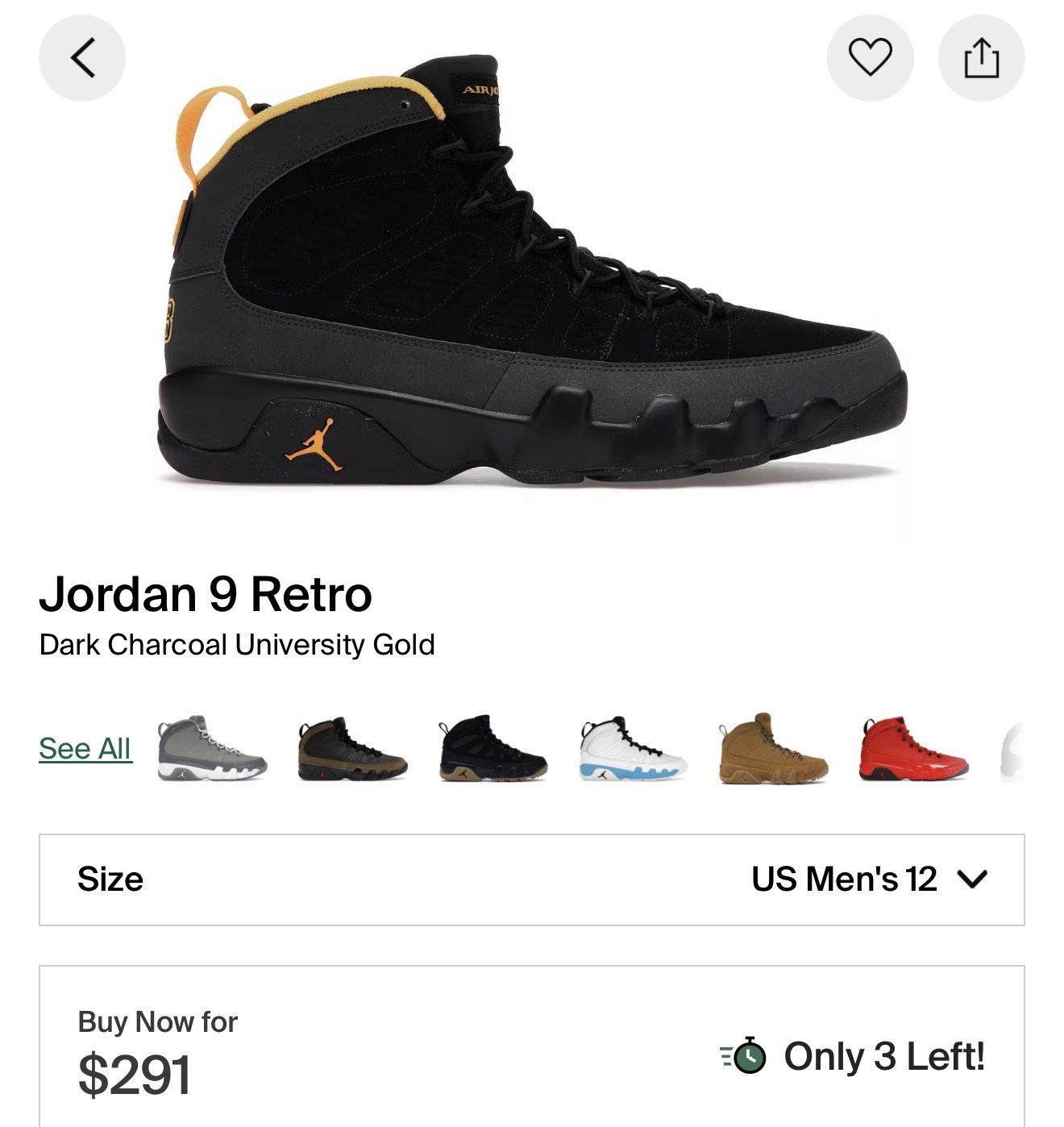 Jordan 9 Retro 'Dark Charcoal University Gold' (Size 12) Super Clean w/ OG Box