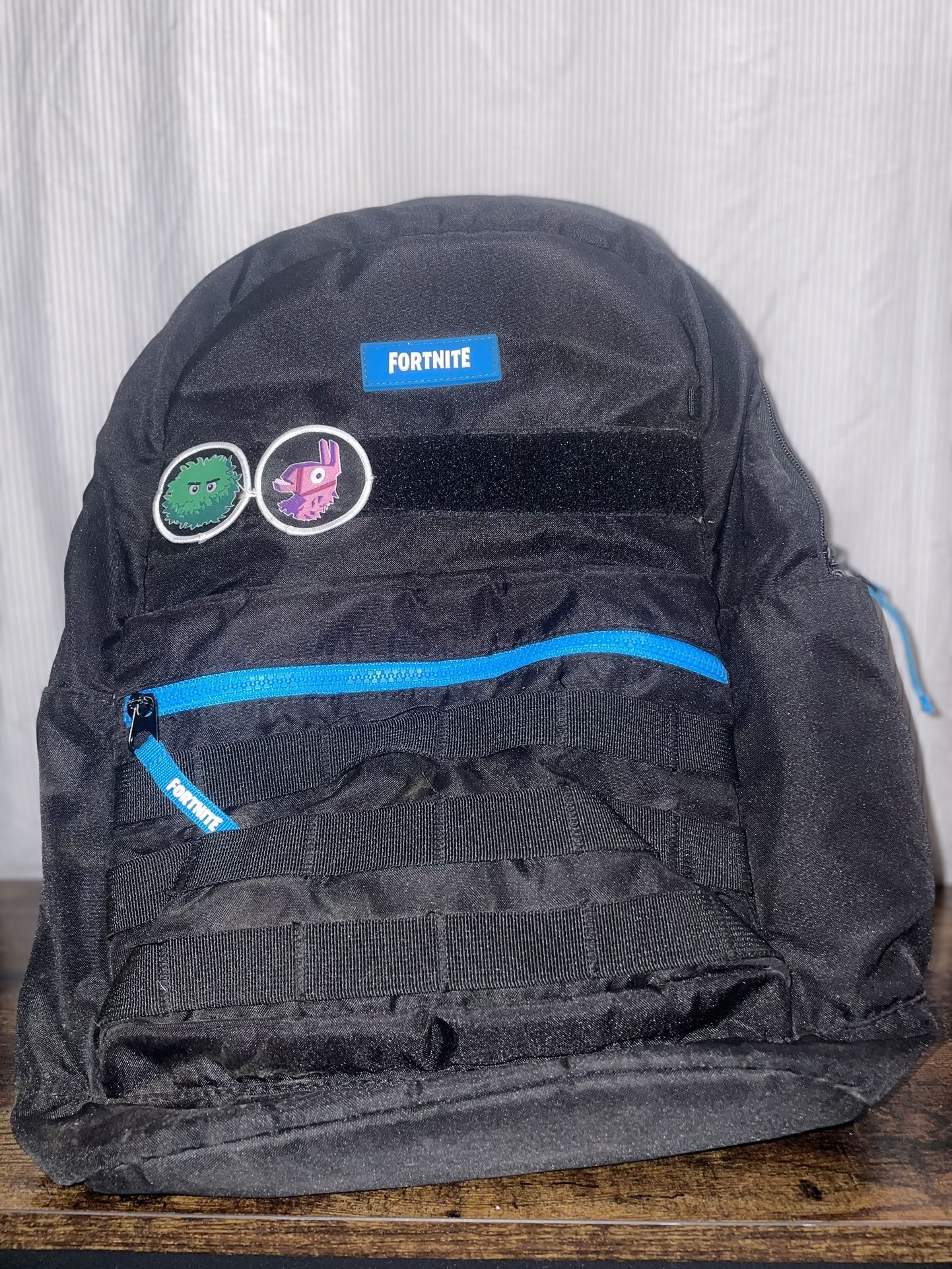 Fortnite bagpack with 2 Velcro patches. Includes a laptop sleeve and water bottle holder as well. In good working condition.