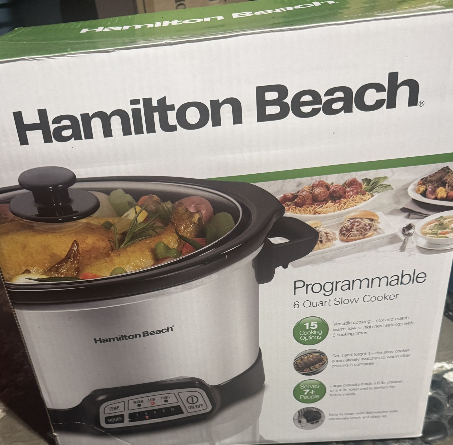 Hamilton Beach 6 Qt. Programmable Slow Cooker. NEW IN THE BOX, Never opened Bought for near 100. Selling for 40 The Hamilton Beach 6 Qt. Programmable Slow Cooker offers features that make traveling with your food a breeze, including a clip-locked lid and full-grip handles. Choose one of 3 heat settings and pre-program a cook time from 30 minutes to 20 hours. Clip-Tight Sealed Lid: Clips lock lid onto slow cooker to help prevent messy spills, perfect for traveling to potlucks, tailgates or other gatherings. Full-Grip Handles: Makes carrying the slow cooker from kitchen to car easier. Large Capacity: 6 quart capacity is the perfect size for 6 lb chicken or 4 lb roast. High, Low and Warm Heat Settings: Cook on Low or High, and the slow cooker will switch to Warm automatically when your food is done. Pre-Program A Cook Time. Set a custom cook time between 30 minutes and 20 hours.