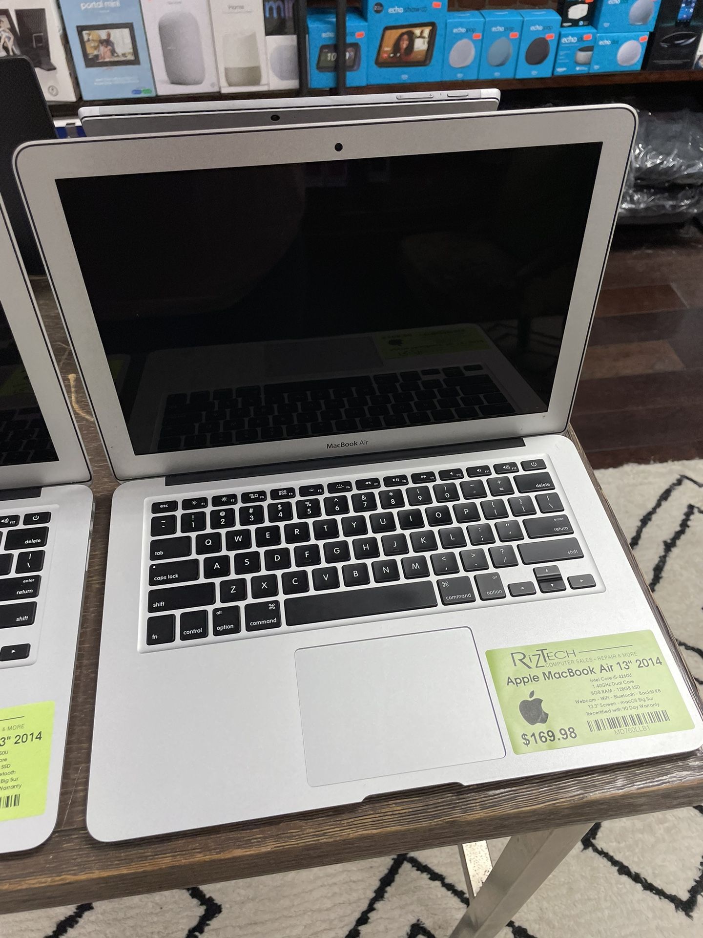 Available at RizTech. https://offerup.com/redirect/?o=aHR0cHM6Ly93d3cucml6dGVjaG1lZGluYS5jb20vYWJvdXQtdXM= MacBook Air 13" 2014 Intel Core 15-4260U 1.40GHz Dual Core 8GB RAM 128GB SSD Webcam Wifi Bluetooth Backit Keyboard 13.3” screen macOS Big Sur Recertified with 90 Day Wartanty $169.98