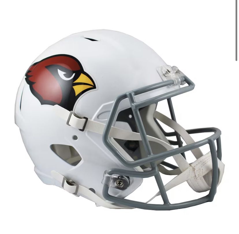 The full size Riddell replica Revolution Speed helmet is made of plastic. It features a steel polyvinyl-coated face mask, 4-pt chin strap and elliptical air vents. Team logo decals are displayed on the shell. This helmet is not for competitive play. Officially licensed by the National Football League.