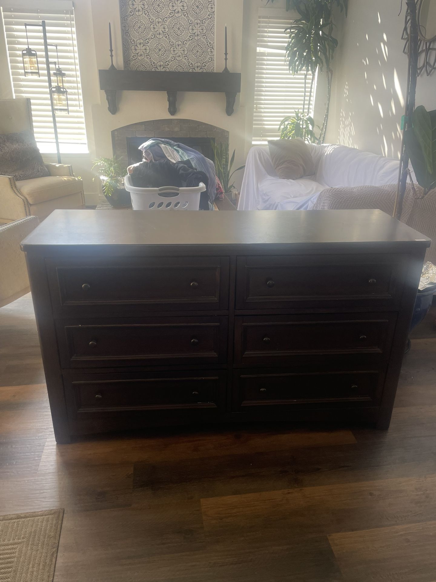 Sturdy dark wood dresser in good condition. Features 6 spacious drawers with smooth pulls, perfect for clothes, linens, or extra storage. Modern dark espresso finish that fits well with most dΓ©cor. π Dimensions: β’ Length: ~60β β’ Height: ~33β β’ Depth: ~18β20β This dresser is solid and heavy, built to last. Has some light surface wear from normal use, but overall looks great and functions perfectly.