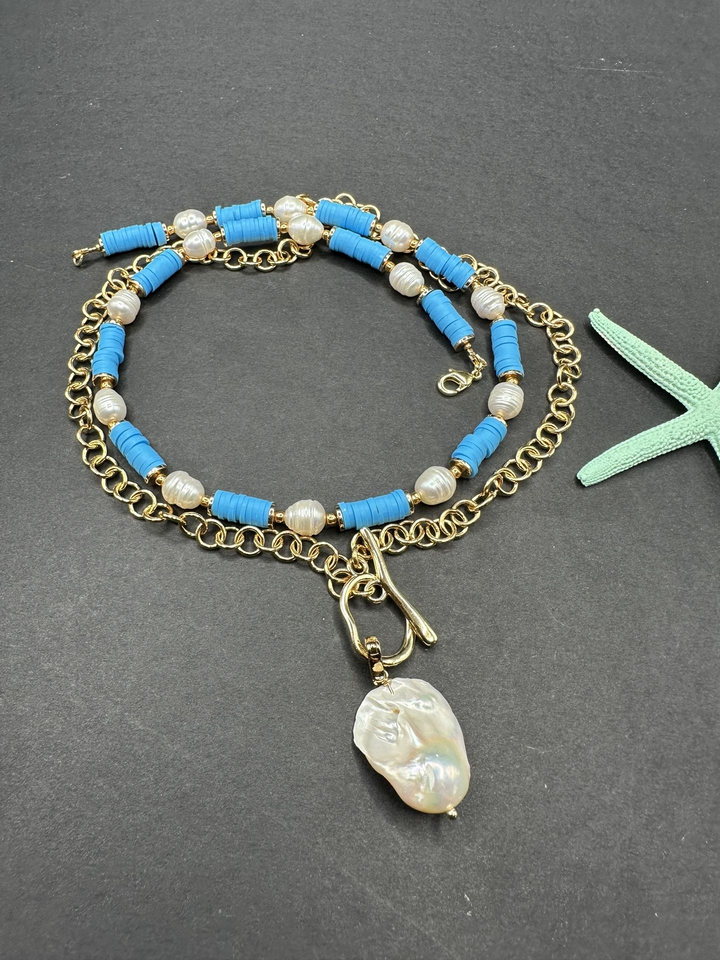 1) Bright choker made of resin beads and freshwater pearl. rice type. Grade A (grown natural ring) L 17 inch 2) Gold plated chain with pendant -big baroque pearl. Grade AA (other side has spots) Good Luster. Price for set. The fittings and chain are made of hypoallergenic brass and coated with 14k. gold. ( nickel and cadmium free). Not easy tarnish. π included. π del ivery local (5 miles or pick up) I make jewelry of pearls and natural stones. Each piece of jewelry is unique and individual. All photos were taken without any filters. You get exactly what you see.