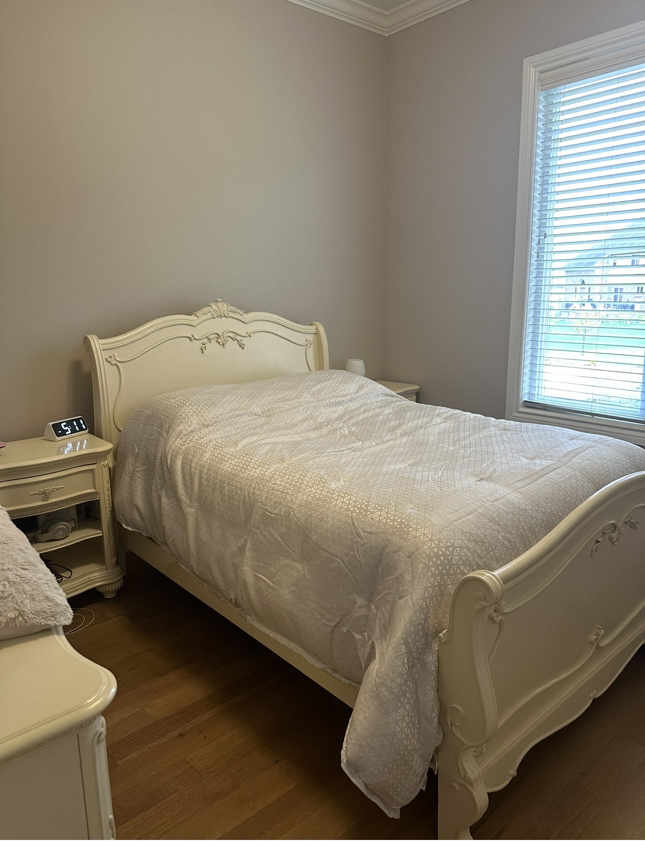 Full size bed, dresser, mirror, and 2 nightstands. One drawer is alittle misaligned but can be fixed. $300.00