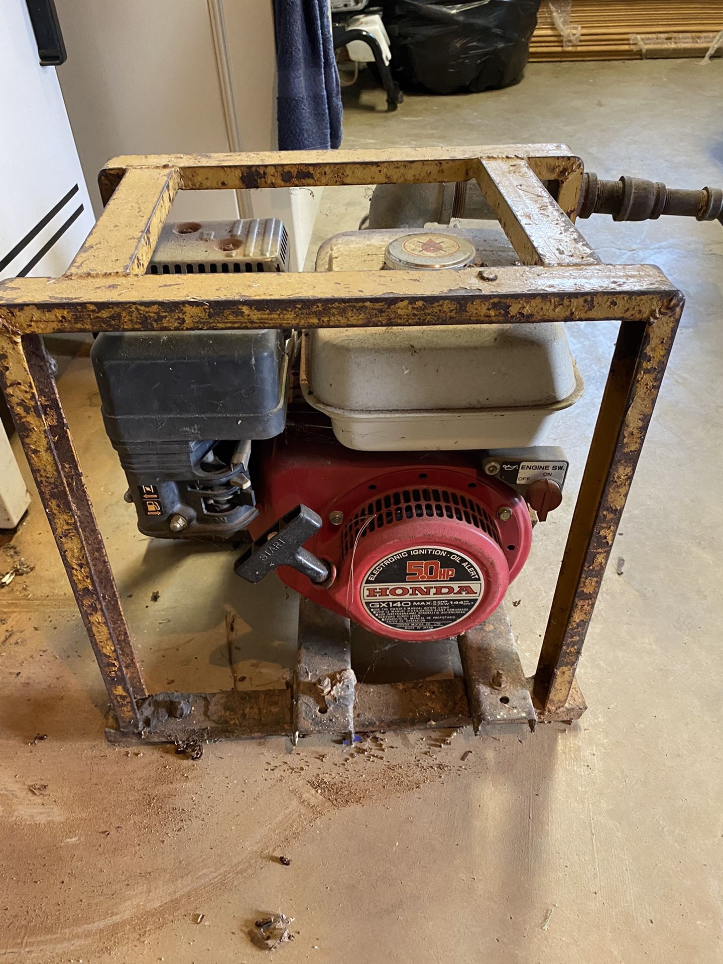 Trash water pump with all hoses…pickup and and discharge…has not been run for several years will definitely need a tuneup and probably carb cleaned