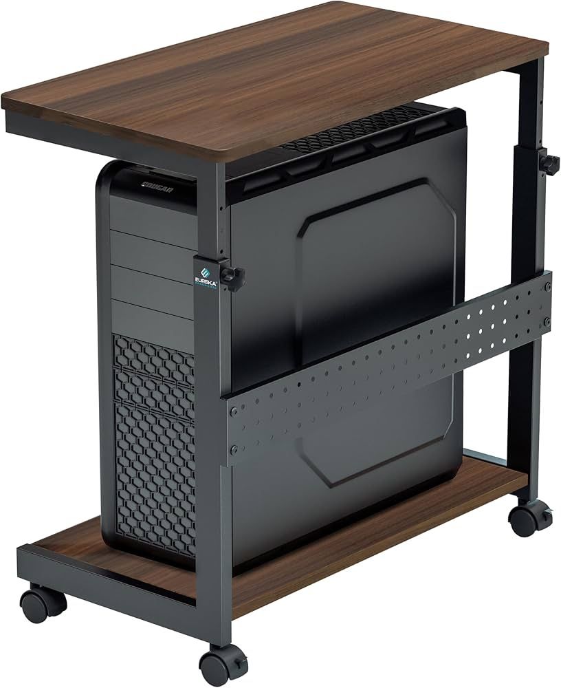Height Adjustable Tower Stand: Unique manual height adjustable range from 23 1/4'' to 33 1/4'' allows you to store tower under your desk or next to your table, support most computer cases on the market including full size ATX case. Customize height to increase distance between the computer tower and top shelf to speed up heat dissipation Multifuctional Design: Efficient 2-tier design. The bottom shelf stores the computer tower while the top shelf holds printers, smaller PC, mixer, plants, documents, and magazines. Pegboard on back organizes office supplies such as power strips, etc. Mousepad included, this CPU stand can be used for mouse operation & comfortable arm rest. Can also be used as mobile laptop stand or rolling computer desk that allows you to settle into any place for work like bed and sofa, ready to set up Mobility and Stability: Four 360-degree rotating mute wheels (w/ brakes) enable smooth movement on the carpet. Mobile design allows for easier use in home and office even when fully loaded, reducing carpet prints and indentations, and easy to clean the floor. Dual casters with brakes hold the PC stand firmly in place for stable performance Sturdy Structure: EPA TSCA Title VI & CARB Phrase Ⅱ Certified desktop panel with premium anti-scratch finish. Thickened steel frame with powder-coated finish resists corruption to ensure stability and durability, not easy to scratch or deform, no wobbling. The bottom shelf max weight up to 100LBS, top shelf is 80 LBS. NOTE: When moving, the computer tower stand can only supports up to 80 LBS