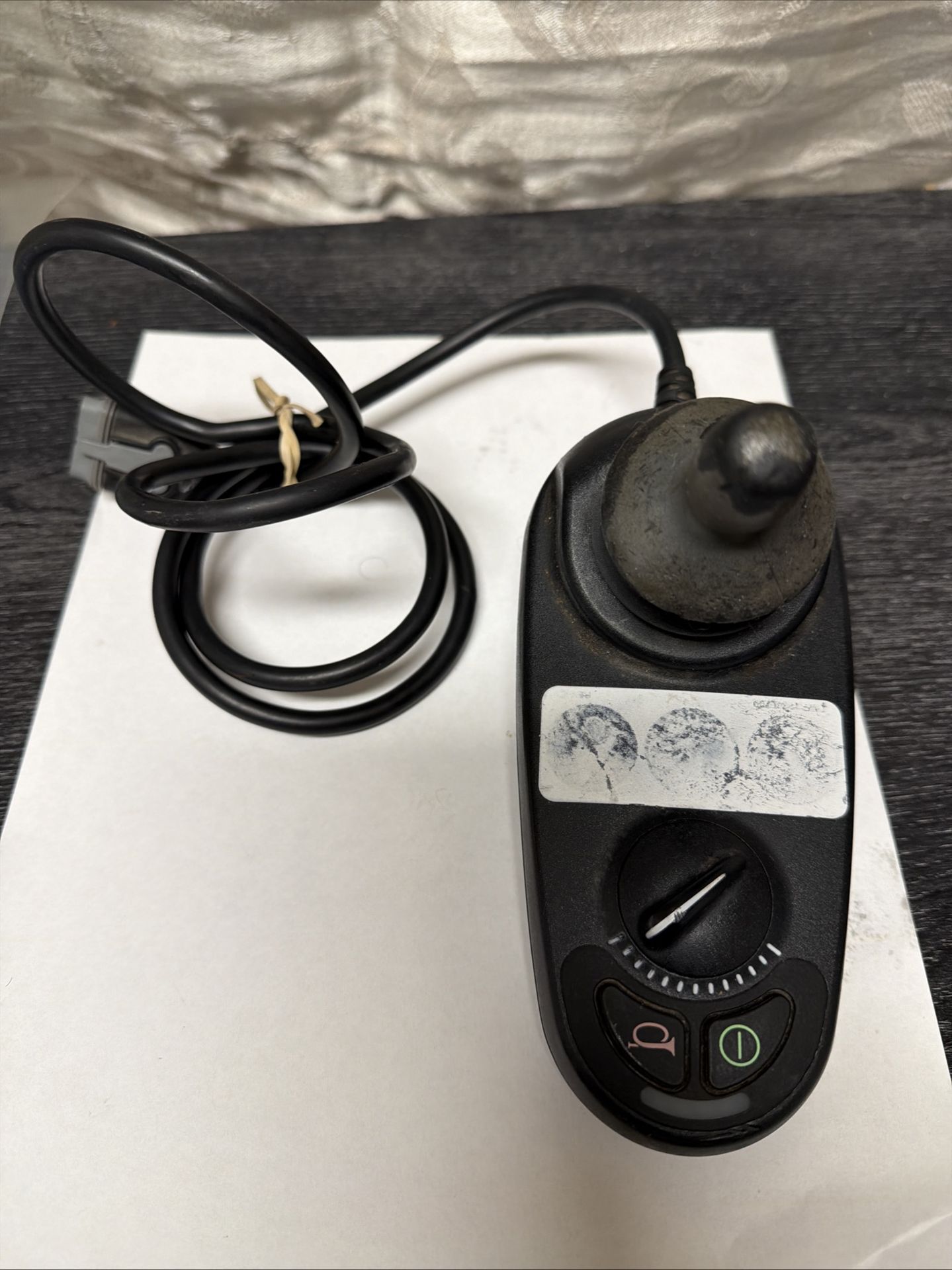 This object is a joystick controller for electric wheelchair, specifically compatible with models such as the Pride Jazzy Select and Jazzy Elite. Product type: Remote controller for electric wheelchair. Compatibility: Pride Mobility electric wheelchairs (Jazzy, Jet, Quantum series). Connector: It usually has a 4-pin connector. Features: Includes a joystick for navigation, a speed control dial and functional buttons such as the horn.